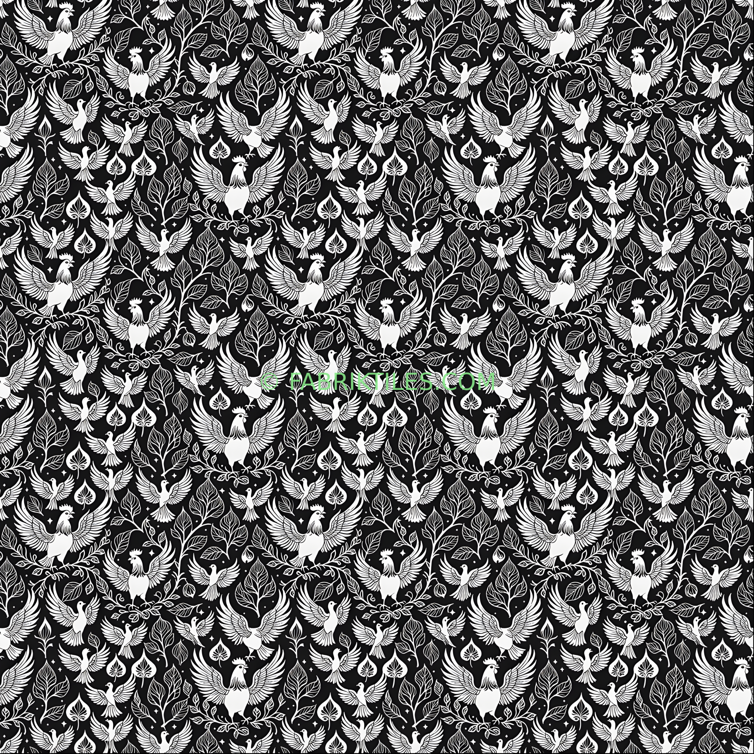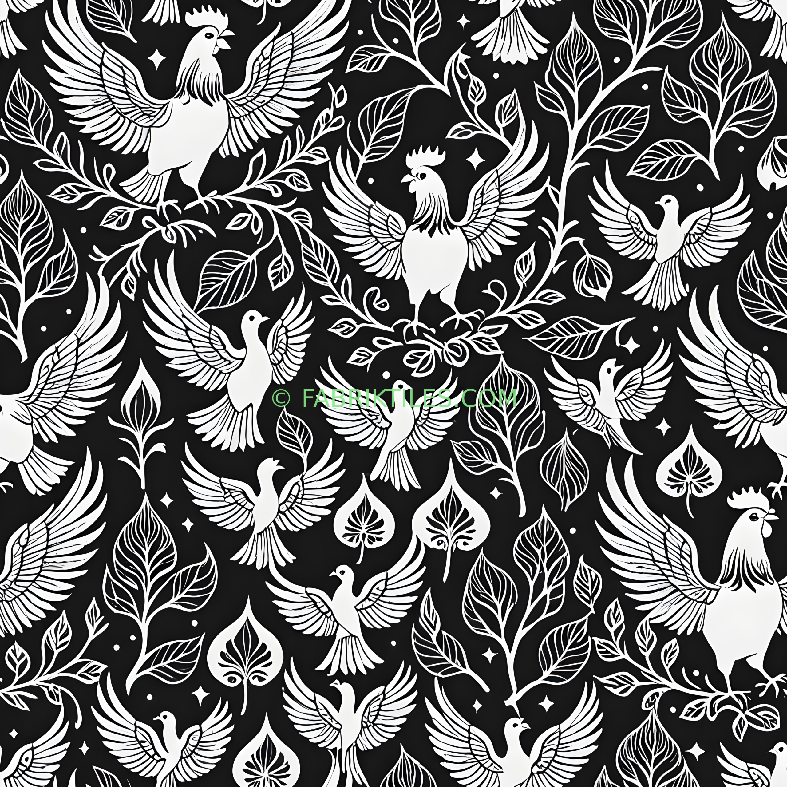 A striking black and white pattern featuring stylized birds in flight and perched on delicate branches, interspersed with leafy foliage and small stars. The high-contrast design creates a bold, graphic look with a whimsical, nature-inspired feel. The intricate linework and repeating motifs evoke a sense of movement and organic elegance.