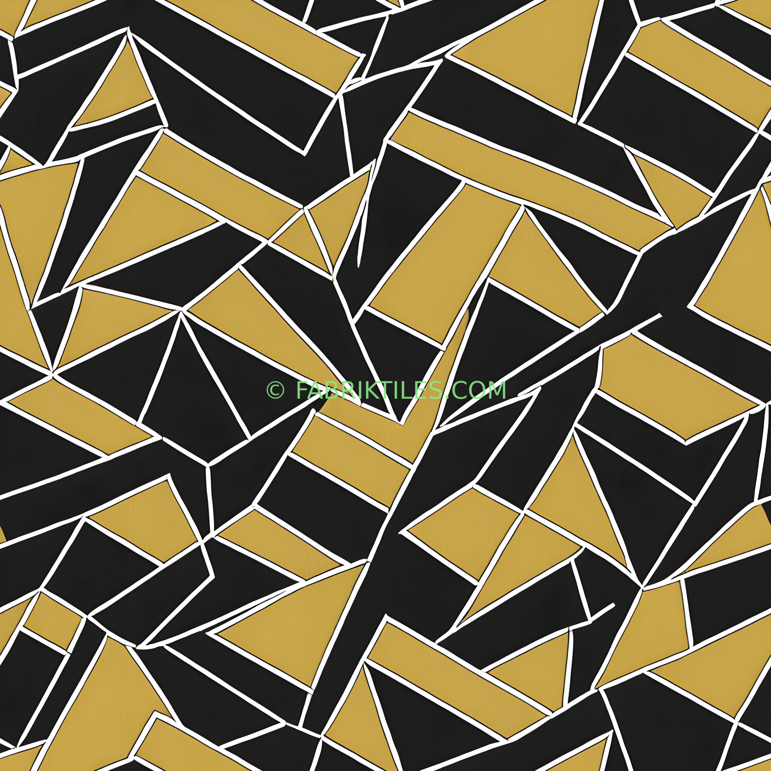 A bold geometric pattern featuring interlocking triangles in rich gold and deep black, outlined in crisp white. The design evokes a modern, luxurious feel with a dynamic, fragmented look. The contrast between warm gold and dark black creates a striking visual impact.