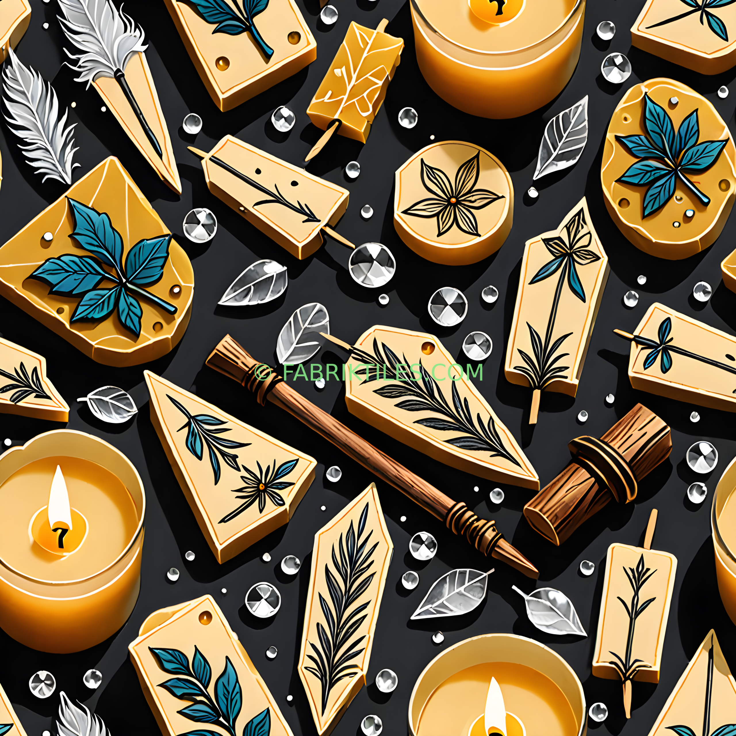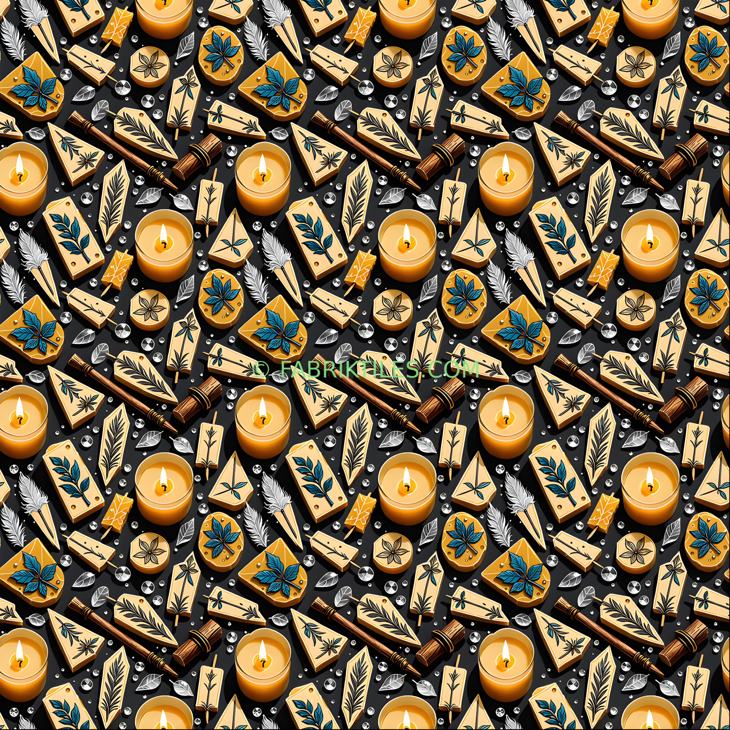 A richly detailed pattern featuring golden candles with flickering flames, delicate white feathers, and ornate botanical motifs in deep blue and black. The design evokes a mystical, candlelit atmosphere with a luxurious contrast between warm golds and cool silvers against a dark background. The intricate arrangement of leaves, crystals, and writing tools creates a sense of ancient magic and scholarly elegance.