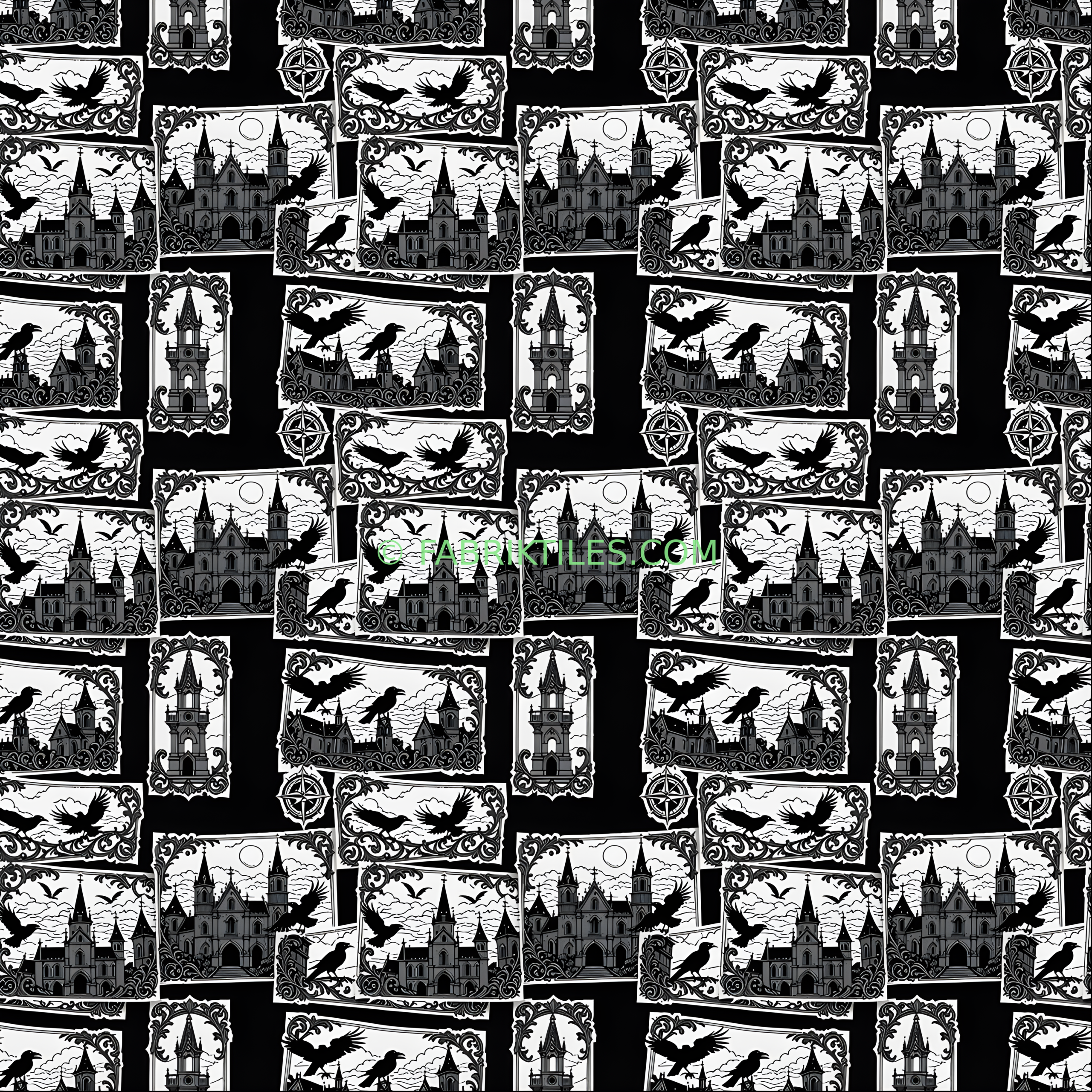 This pattern features gothic cathedrals with pointed spires, silhouetted crows in flight, and intricate floral scrollwork. Rendered in black, white, and shades of gray, the design evokes a mysterious, timeless atmosphere with a strong medieval and macabre feel. The bold, graphic style combines architectural grandeur with dark, whimsical elements.