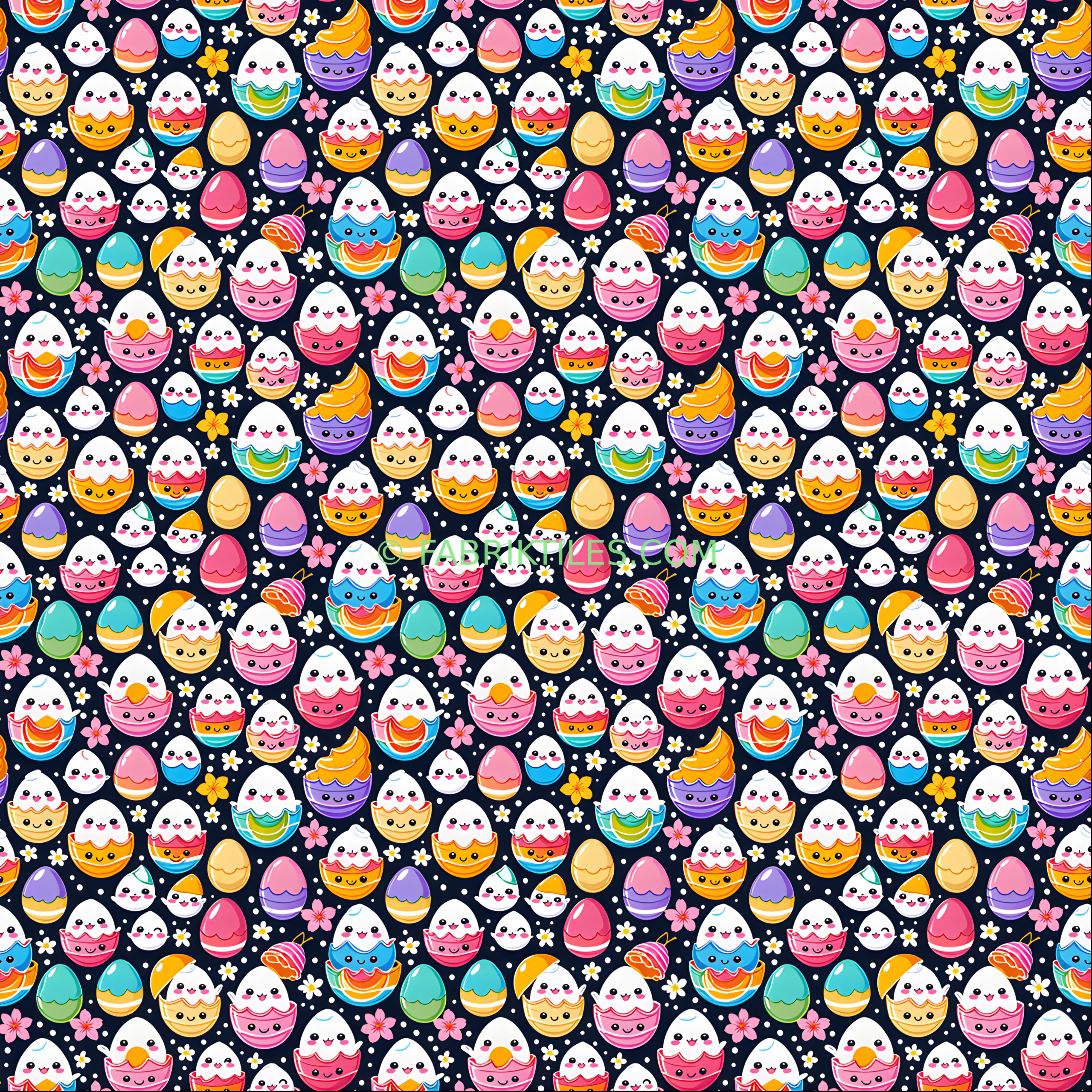 Adorable cartoon eggs with cheerful faces peek out from colorful, cracked shells against a dark background. Delicate flowers and tiny white dots add a whimsical touch to the playful design. The bright, pastel hues create a joyful and festive mood perfect for spring.