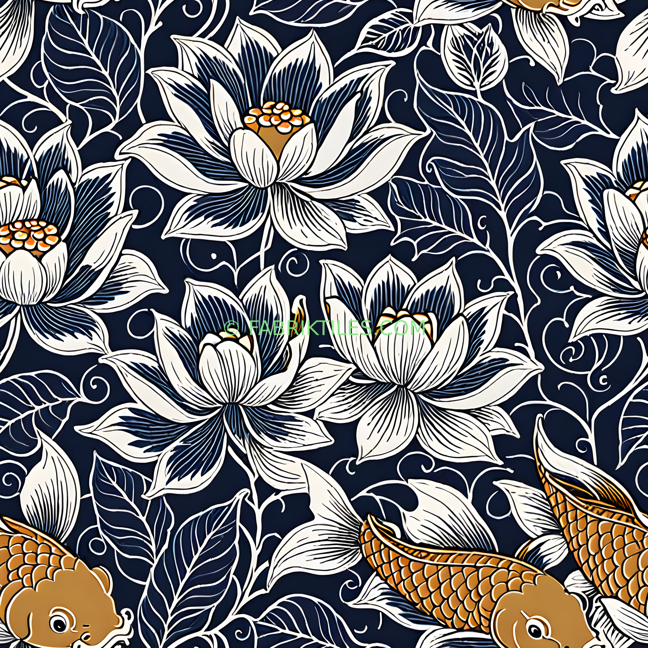 This pattern features elegant white lotus flowers with golden centers and playful koi fish swimming among swirling leaves and vines. Set against a deep navy background, the design blends traditional Asian motifs with a modern, graphic style. The contrast of crisp white and warm gold creates a sophisticated and serene atmosphere.