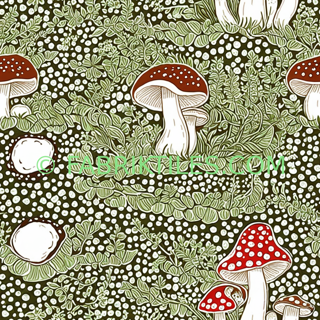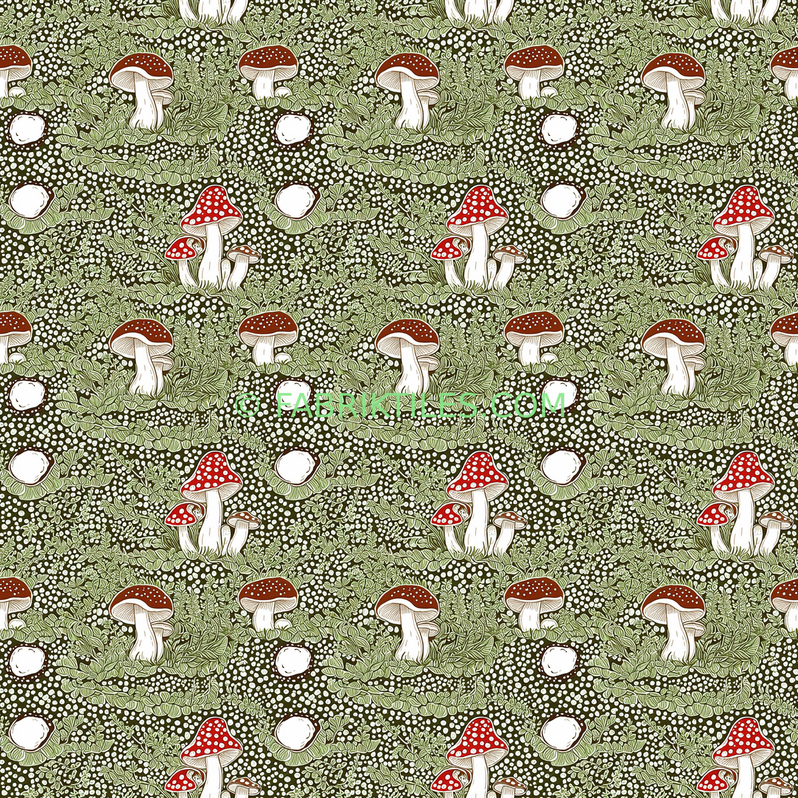 Red-capped mushrooms with white spots emerge from a dense forest floor of green foliage and white dots on a deep olive background.