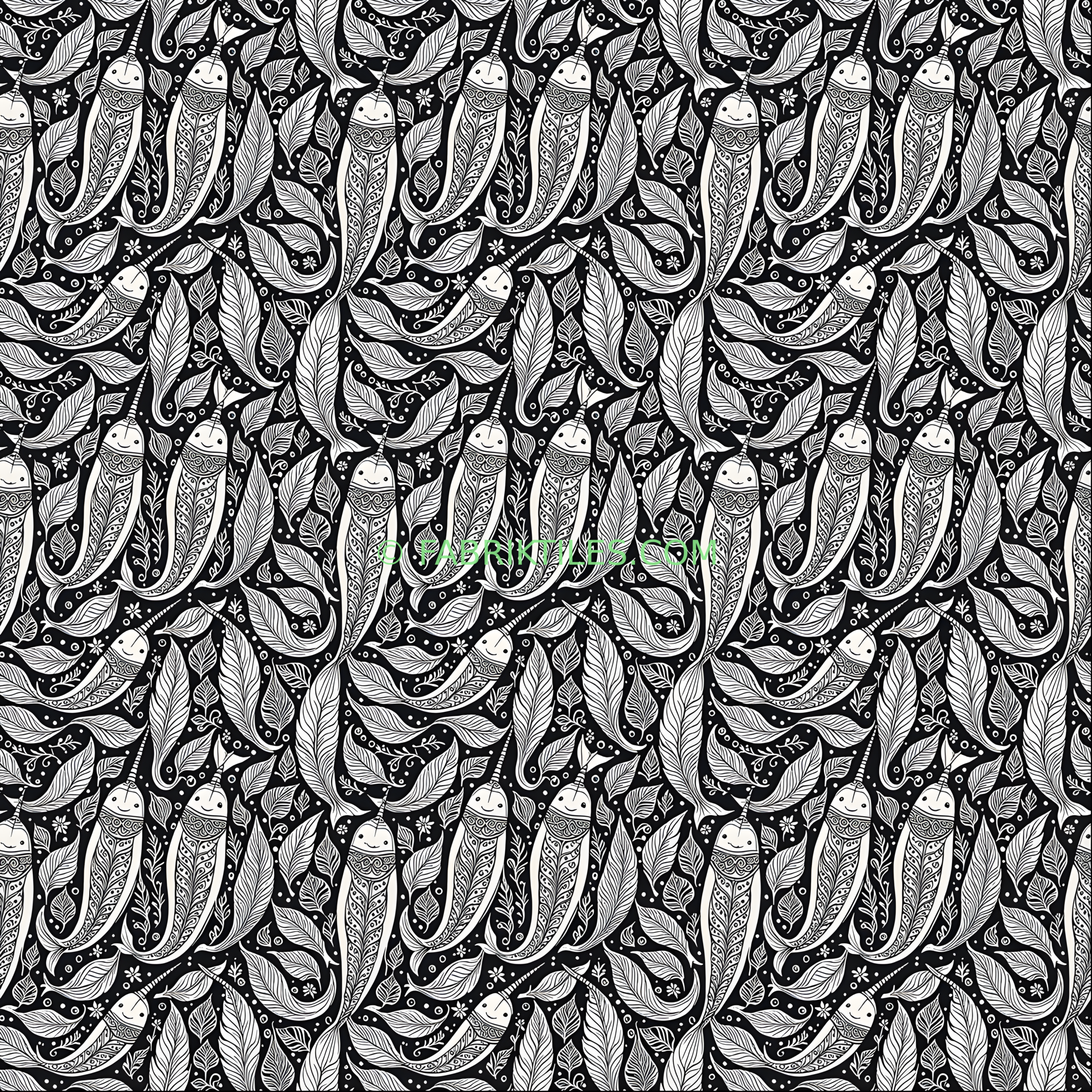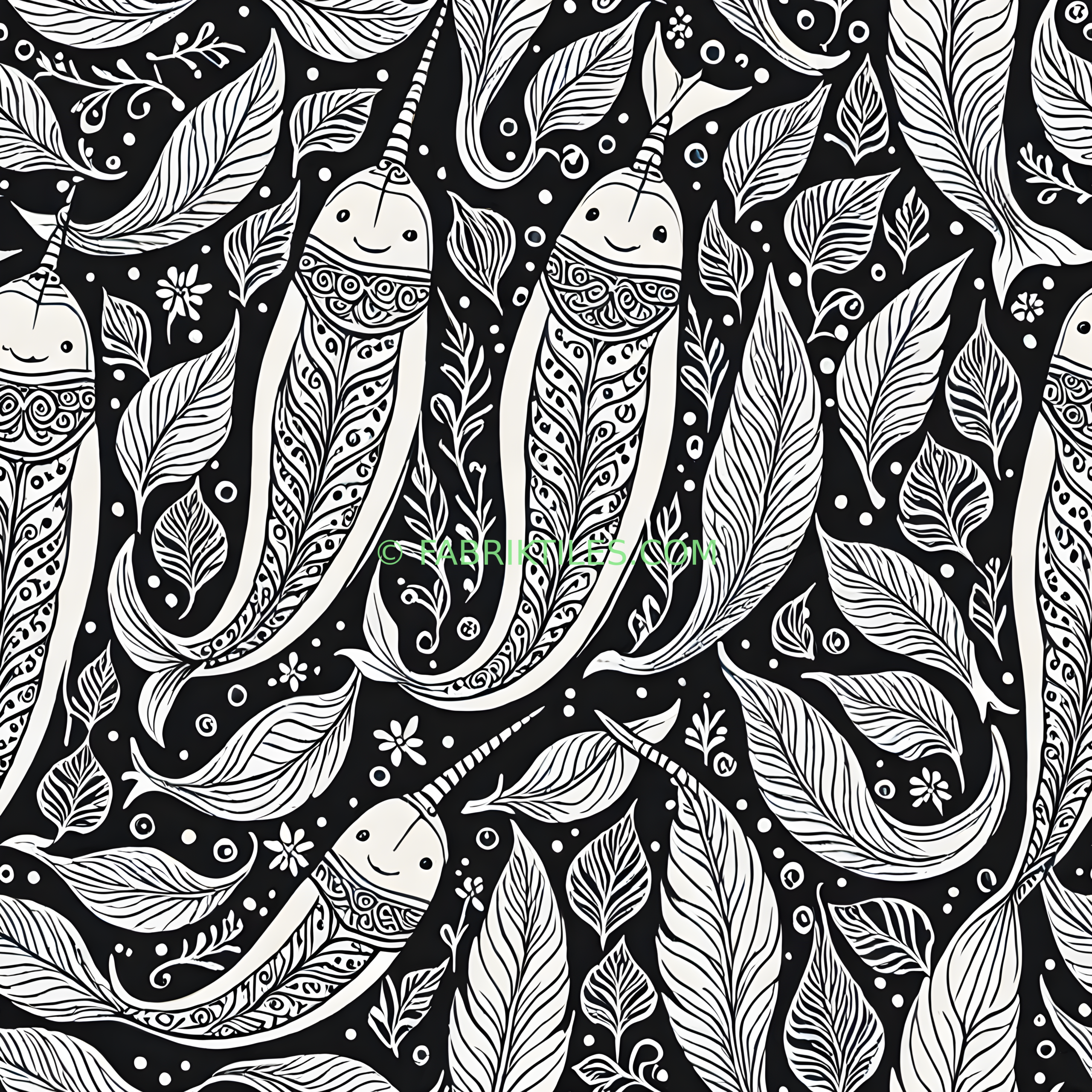 Whimsical narwhals with intricate, swirling patterns swim among delicate feathers and tiny flowers on a deep black background. The high-contrast black and white design creates a playful yet elegant mood, blending fantasy and nature in a hand-drawn style.