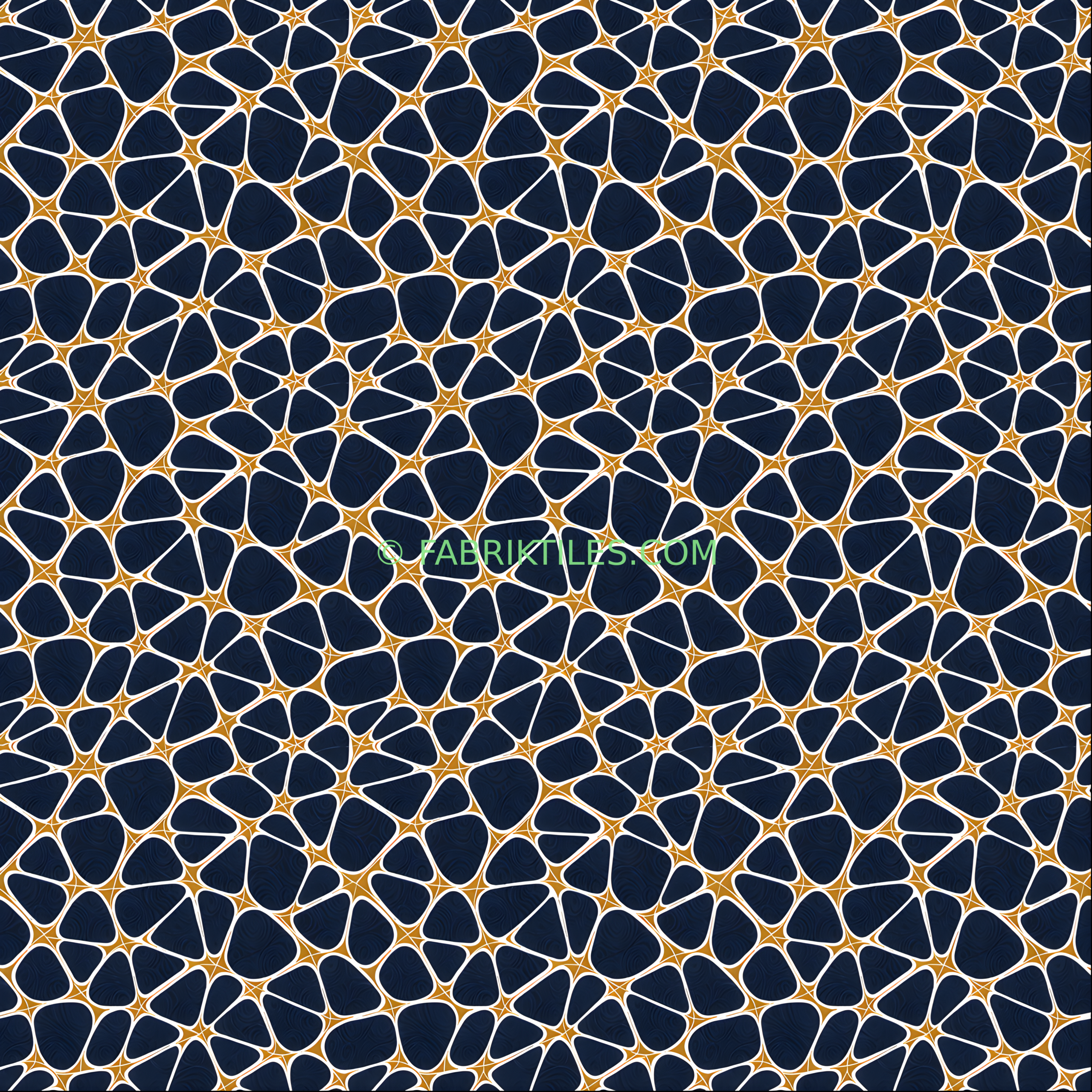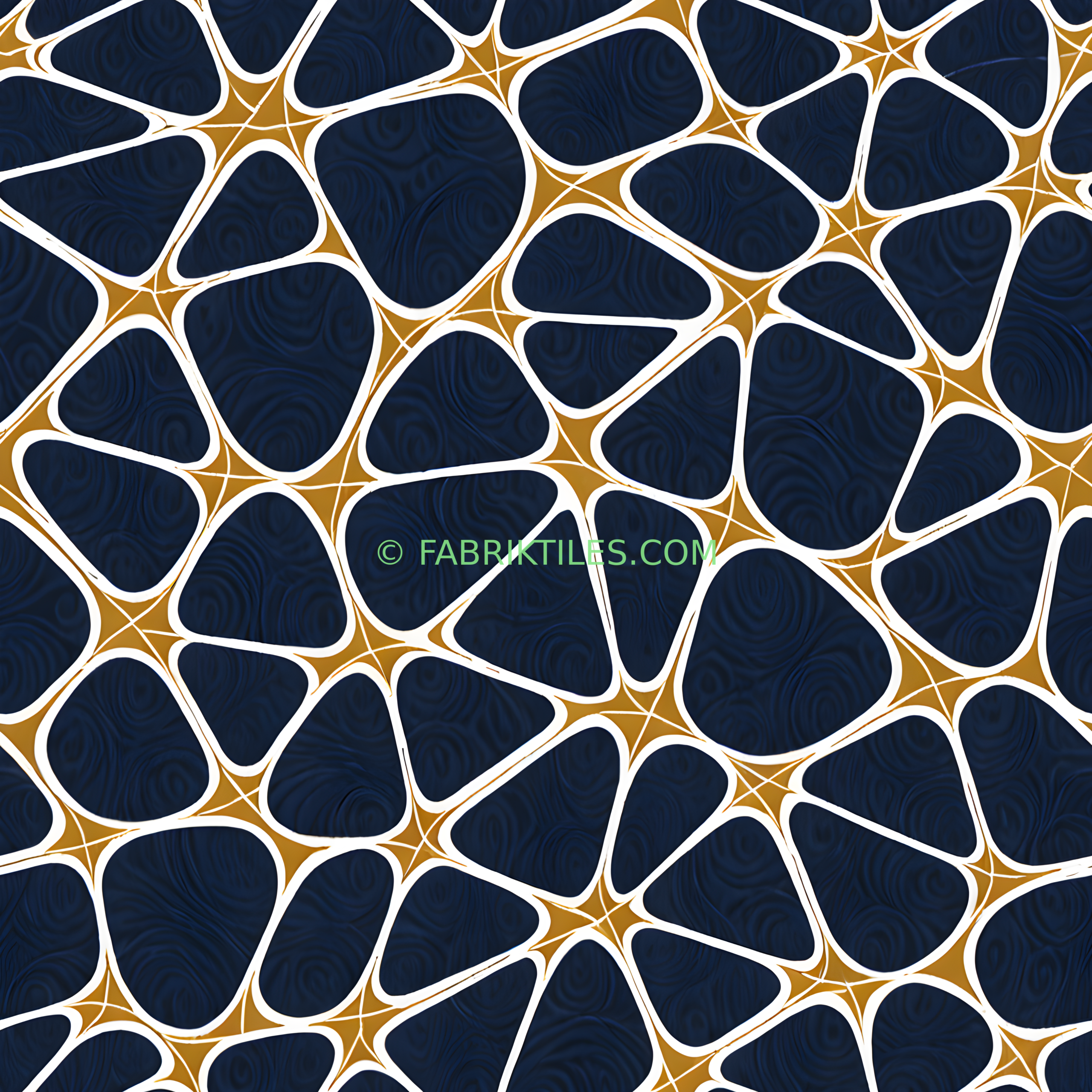 This pattern features deep navy blue shapes with swirling textures, outlined in crisp white and set against a warm gold background. The interlocking forms create a dynamic, mosaic-like effect with a bold and luxurious feel. The rich contrast of dark and metallic tones gives the design a modern, elegant aesthetic.