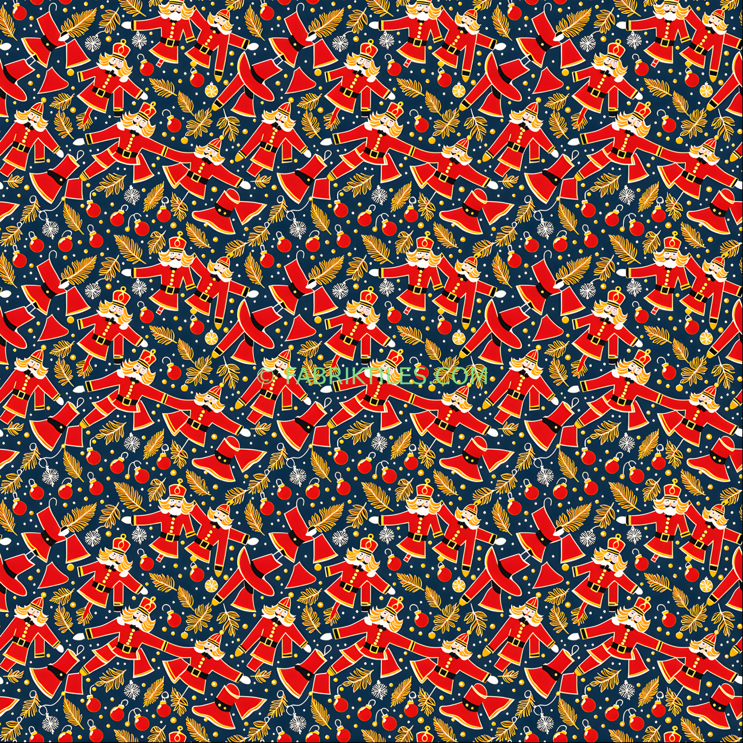 A festive pattern featuring cheerful nutcracker soldiers in red uniforms, golden feathers, red ornaments, and white snowflakes scattered across a deep blue background. The design evokes a whimsical holiday spirit with bold colors and playful details. Perfect for adding a touch of Christmas magic to any project.
