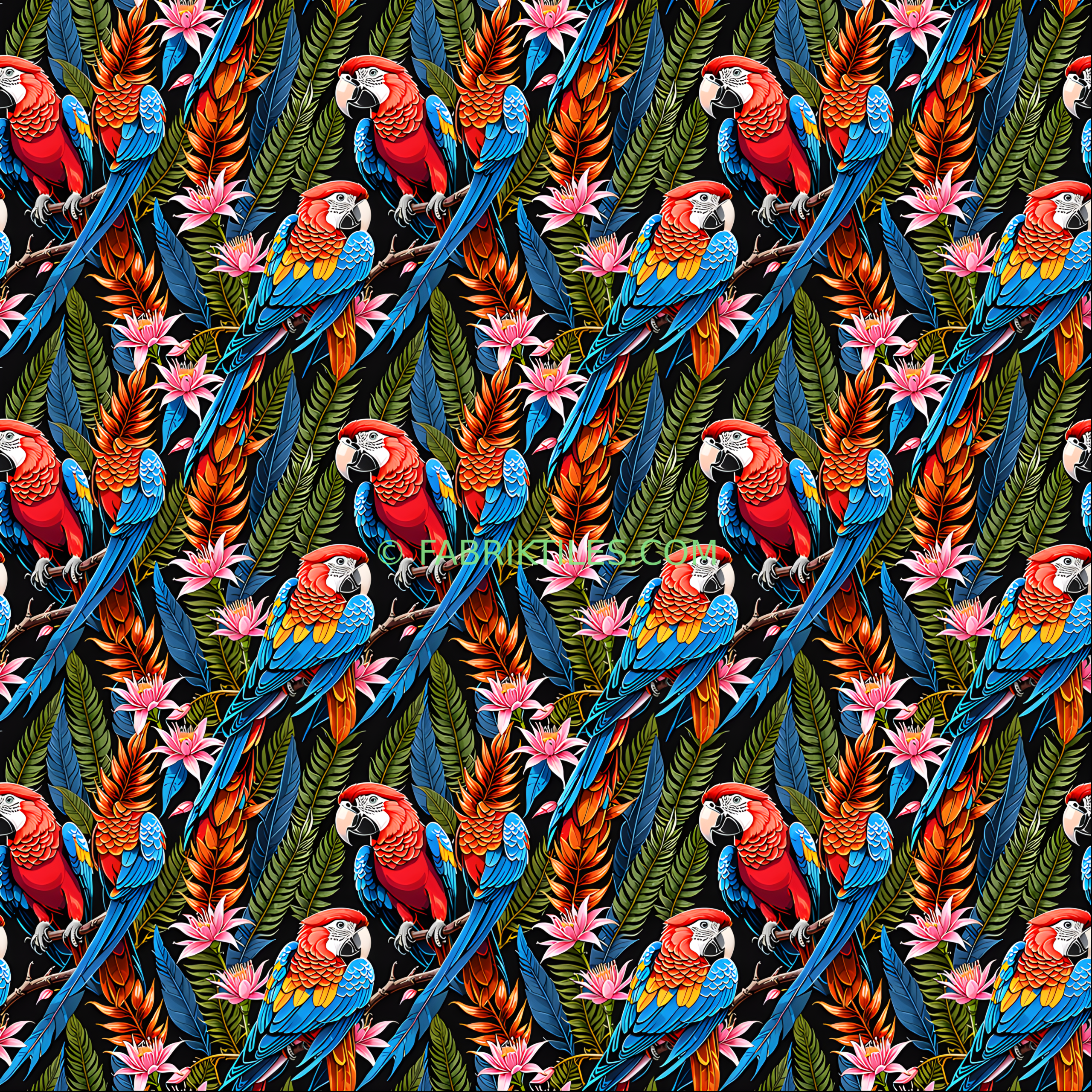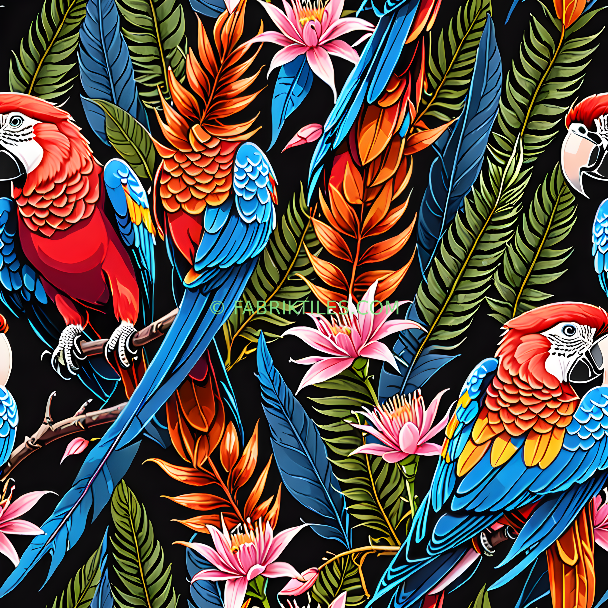 Vibrant macaws with bold red, blue, and yellow feathers perch among lush tropical foliage and delicate pink flowers. The rich, saturated colors pop against a deep black background, creating a lively and exotic jungle atmosphere. This dynamic pattern blends natural beauty with a bold, artistic flair.