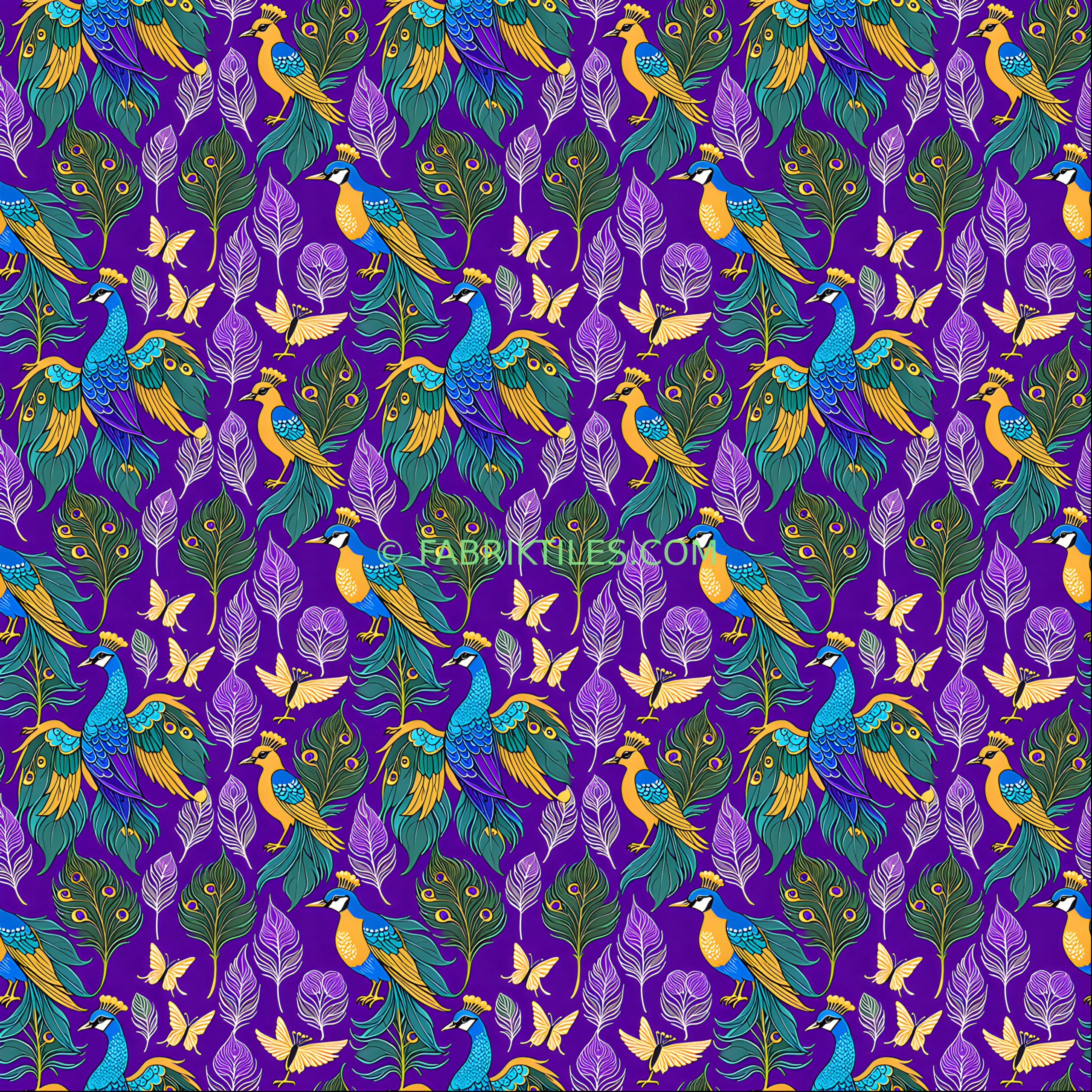 Vibrant peacocks with iridescent blue and green feathers dance across a deep purple backdrop, accompanied by delicate white and purple feathers and golden butterflies. The rich, jewel-toned palette creates a luxurious and enchanting atmosphere, blending natural elegance with whimsical charm. This bold and colorful design evokes a sense of opulence and fantasy.
