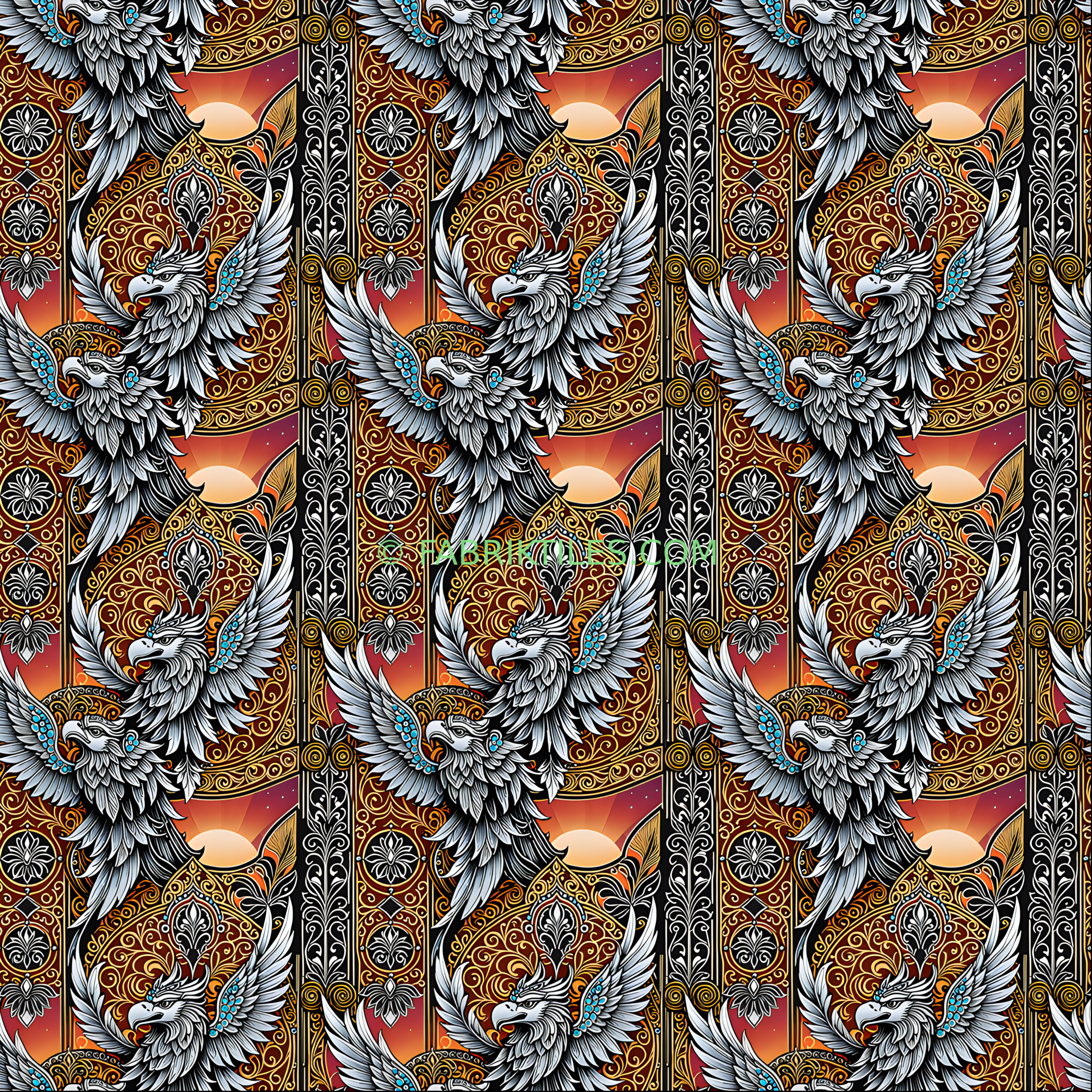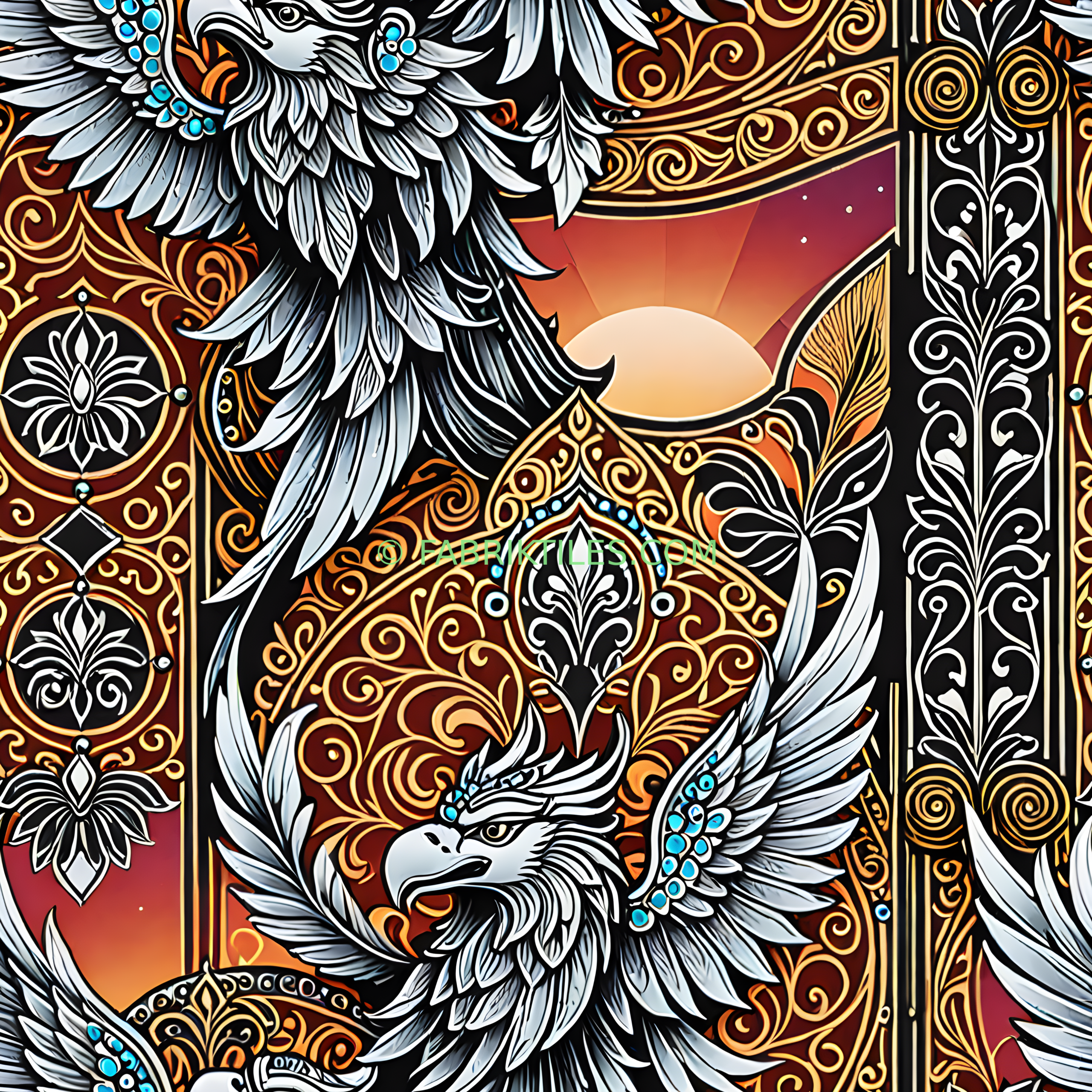 A majestic phoenix with silver feathers and turquoise accents rises amidst intricate golden swirls and warm, glowing tones of orange and red. The design blends mythical elegance with ornate, symmetrical patterns, creating a bold and regal atmosphere. Rich textures and dramatic contrasts evoke a sense of rebirth and timeless beauty.