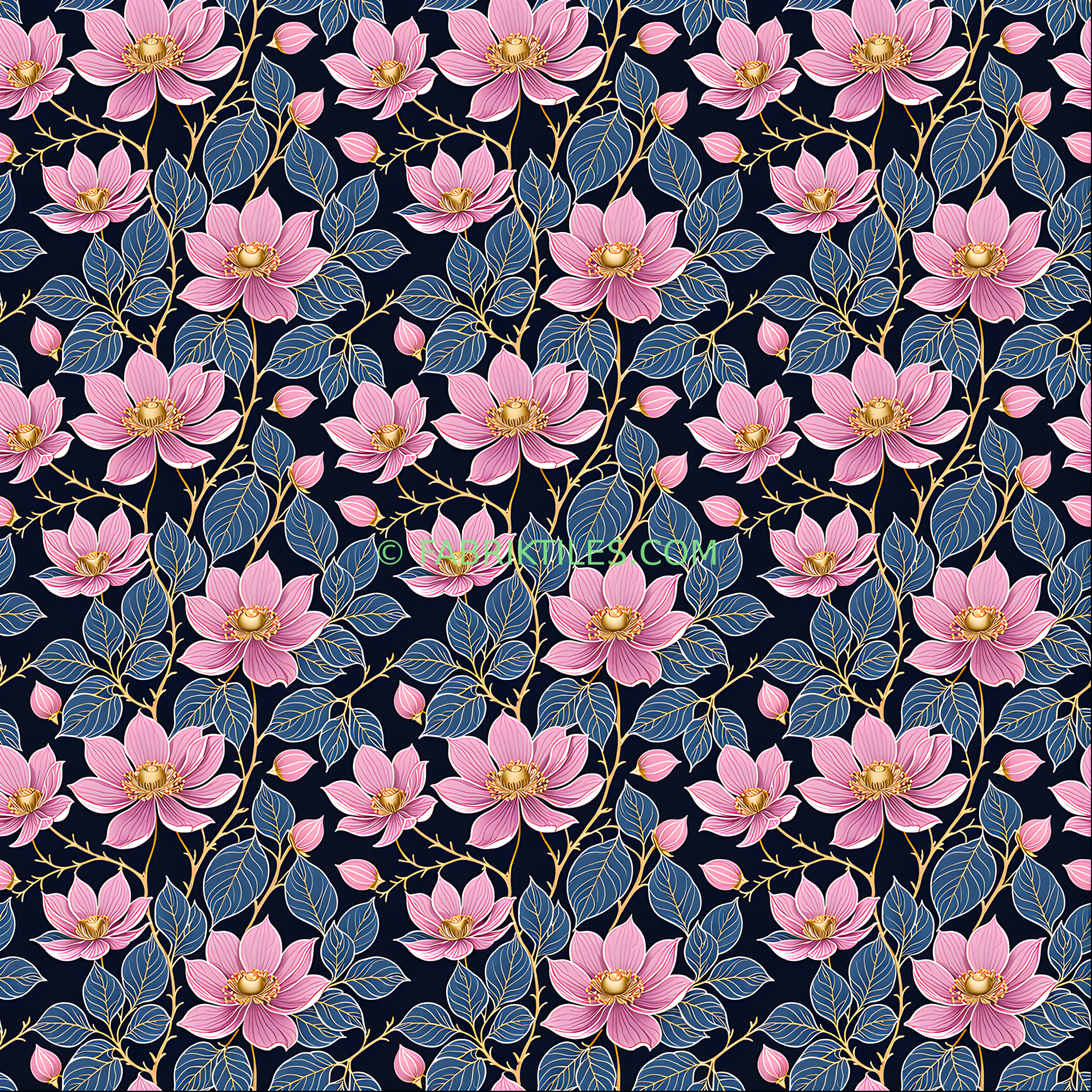 Delicate pink flowers with golden centers bloom amidst deep blue leaves on a dark navy background. The intricate design combines soft floral elements with elegant gold accents, creating a luxurious and romantic atmosphere. This pattern feels both modern and timeless, perfect for adding a touch of sophistication to any space.