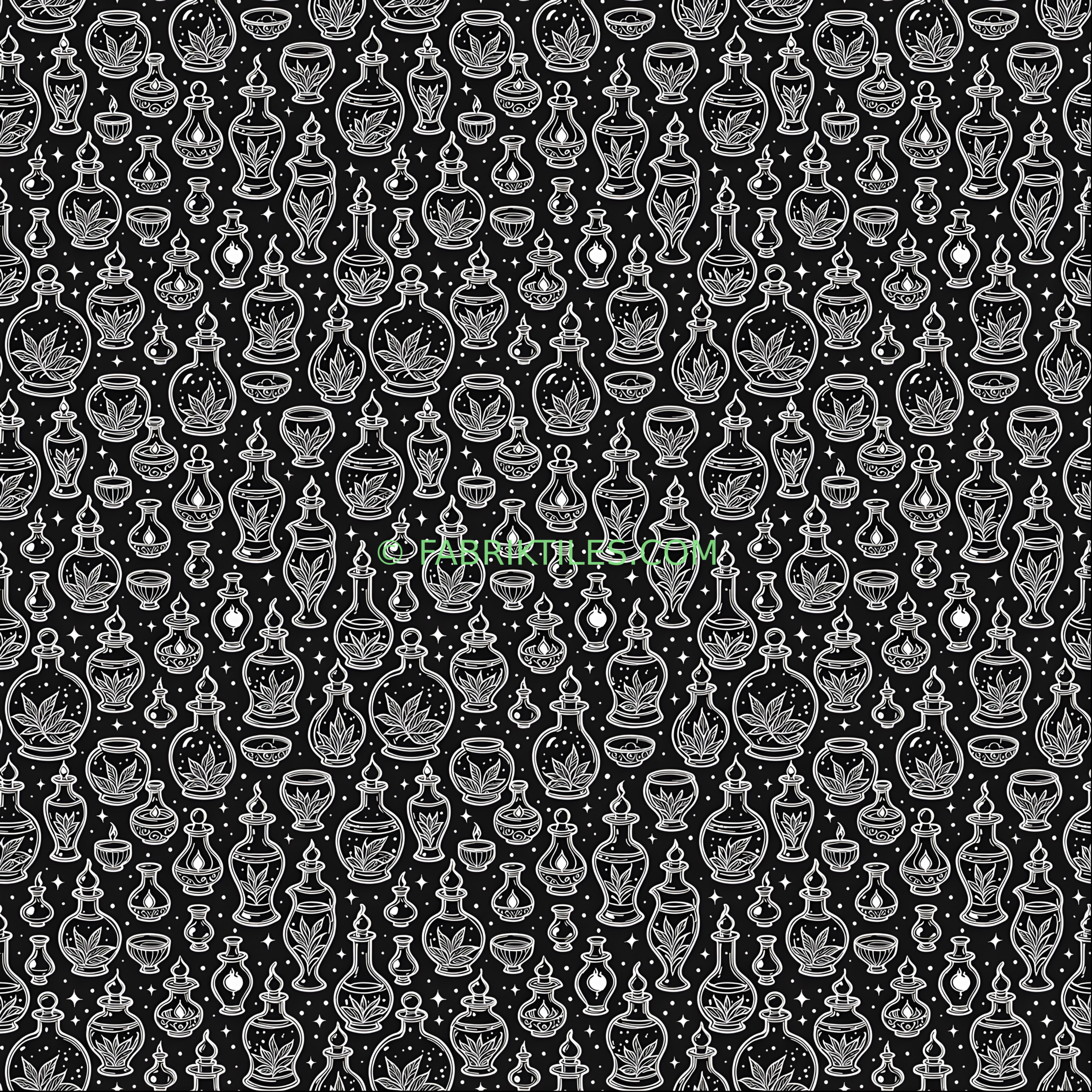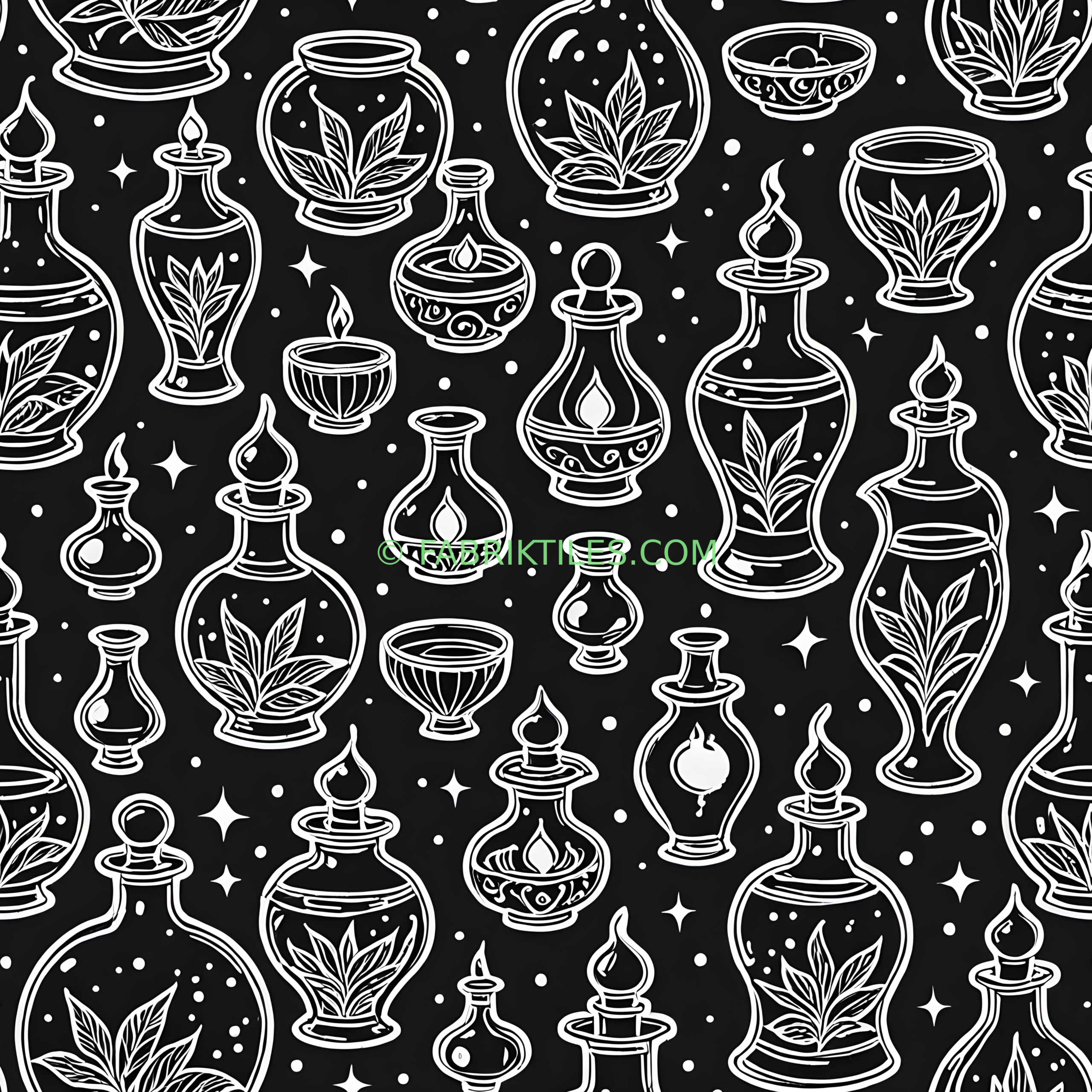 A whimsical pattern featuring white line-drawn potion bottles, glowing candles, and mystical plants against a deep black background. The design evokes a magical, enchanting atmosphere with twinkling stars and floating bubbles adding to the spellbinding charm. Perfect for those who love a touch of witchy elegance in their decor.