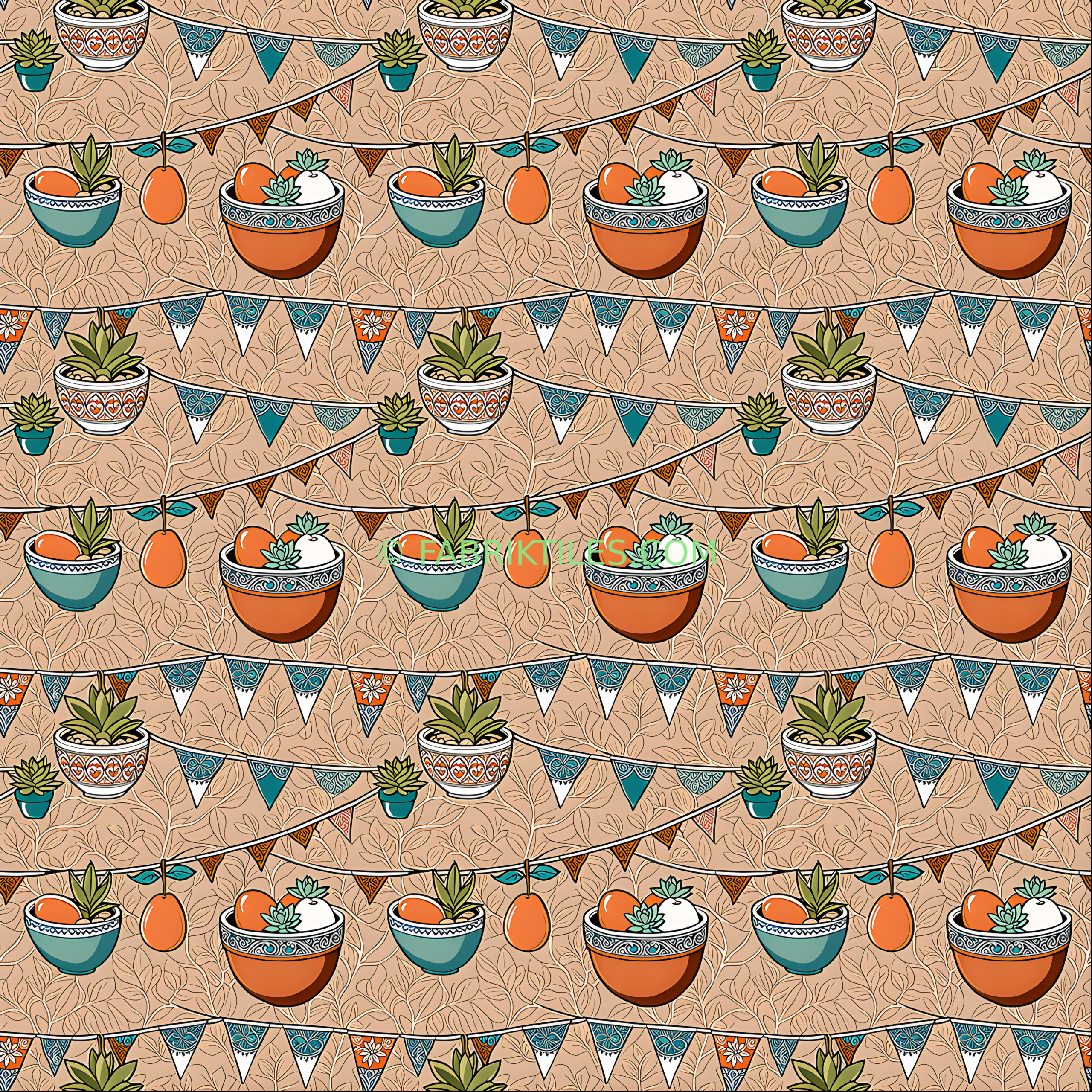 This vibrant pattern features potted succulents, ornate bowls, and hanging bunting flags against a leafy backdrop. Rich earthy tones of terracotta, teal, and orange create a warm, bohemian feel, perfect for adding a touch of whimsy to any space. The intricate details and playful arrangement evoke a cozy, handcrafted charm.