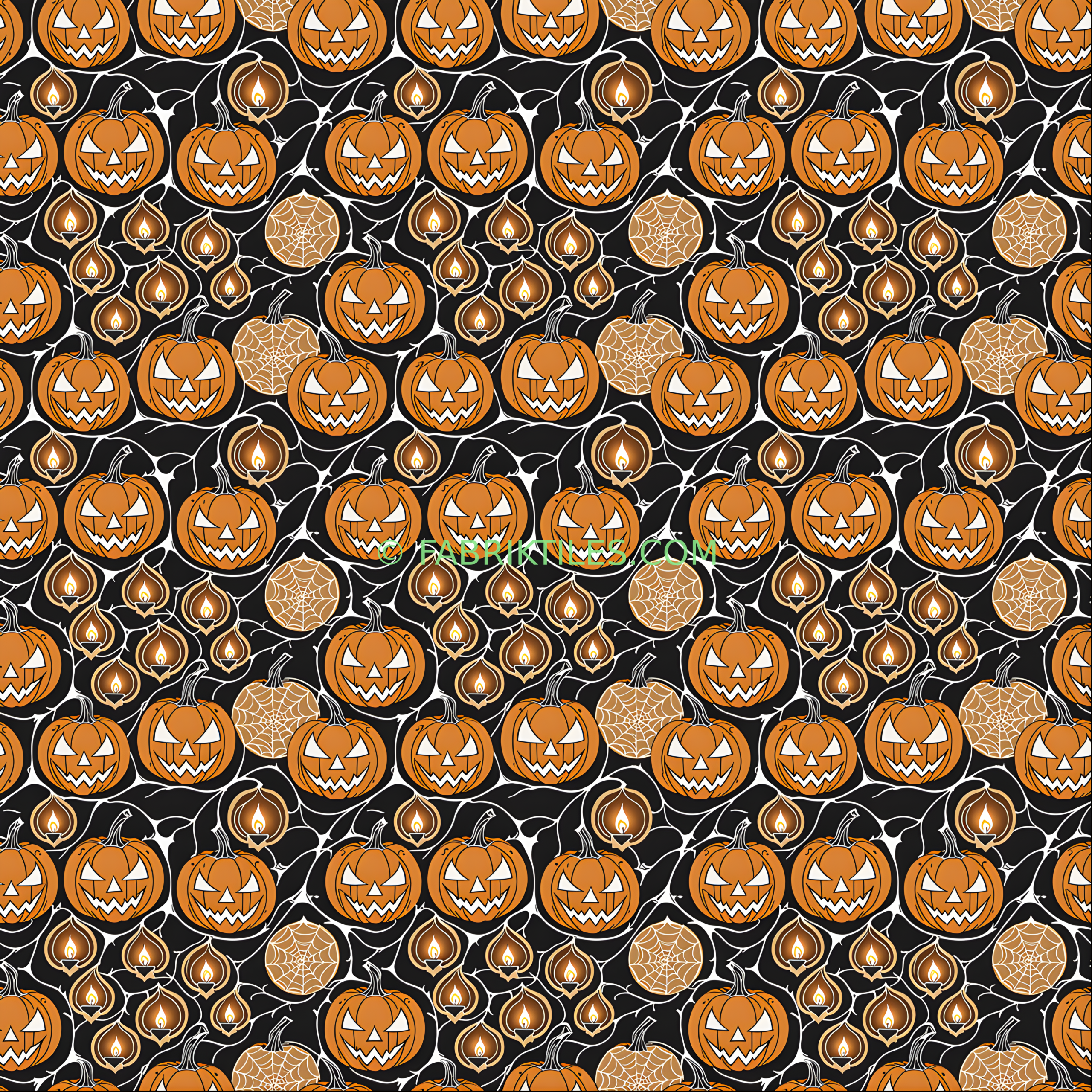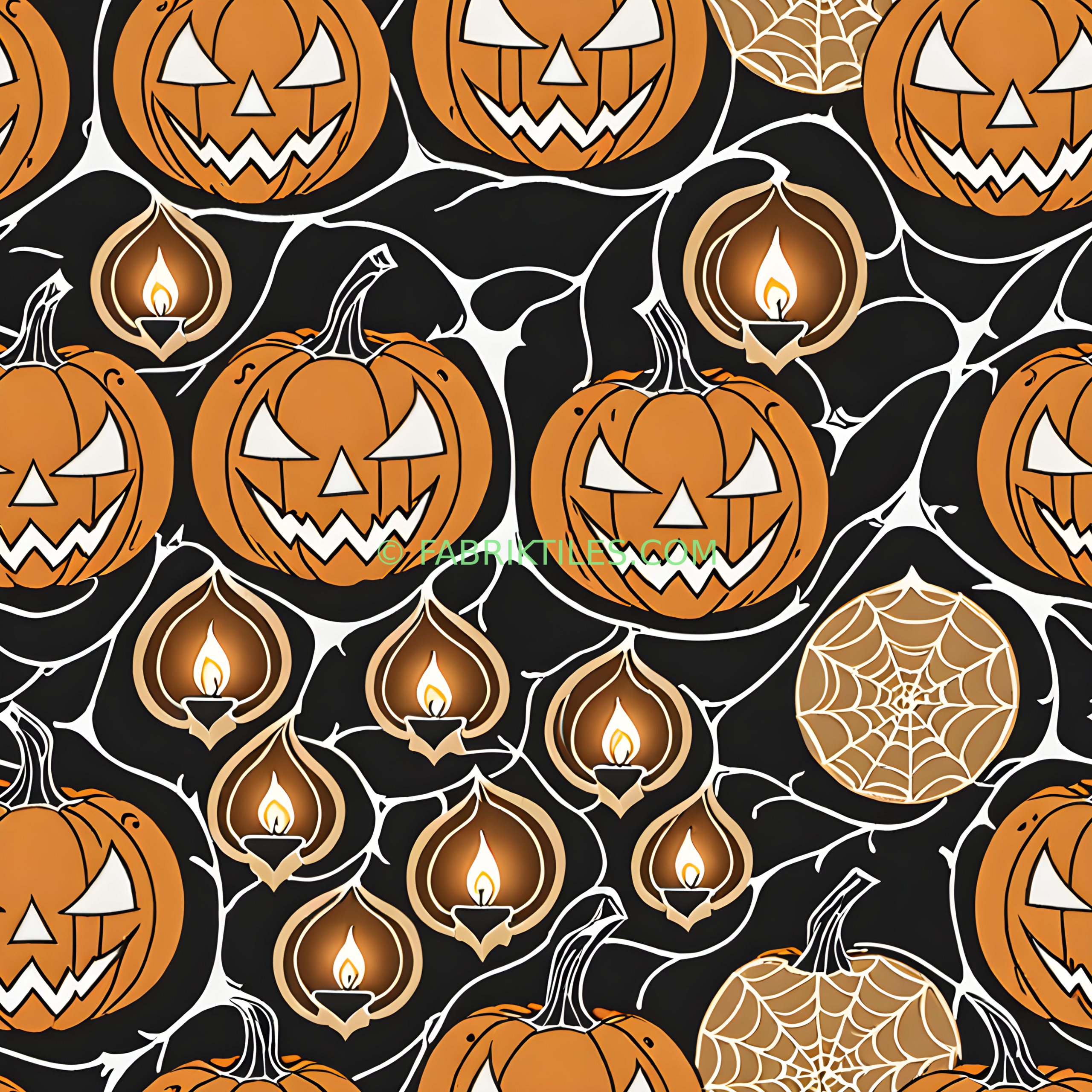A playful Halloween pattern featuring glowing jack-o’-lanterns, flickering candles in ornate holders, and delicate spiderwebs against a deep black background. The design combines warm orange and golden tones with stark white outlines, creating a whimsical yet spooky atmosphere perfect for autumn decor. The repeating motifs evoke a cozy, festive mood with a touch of classic Halloween charm.