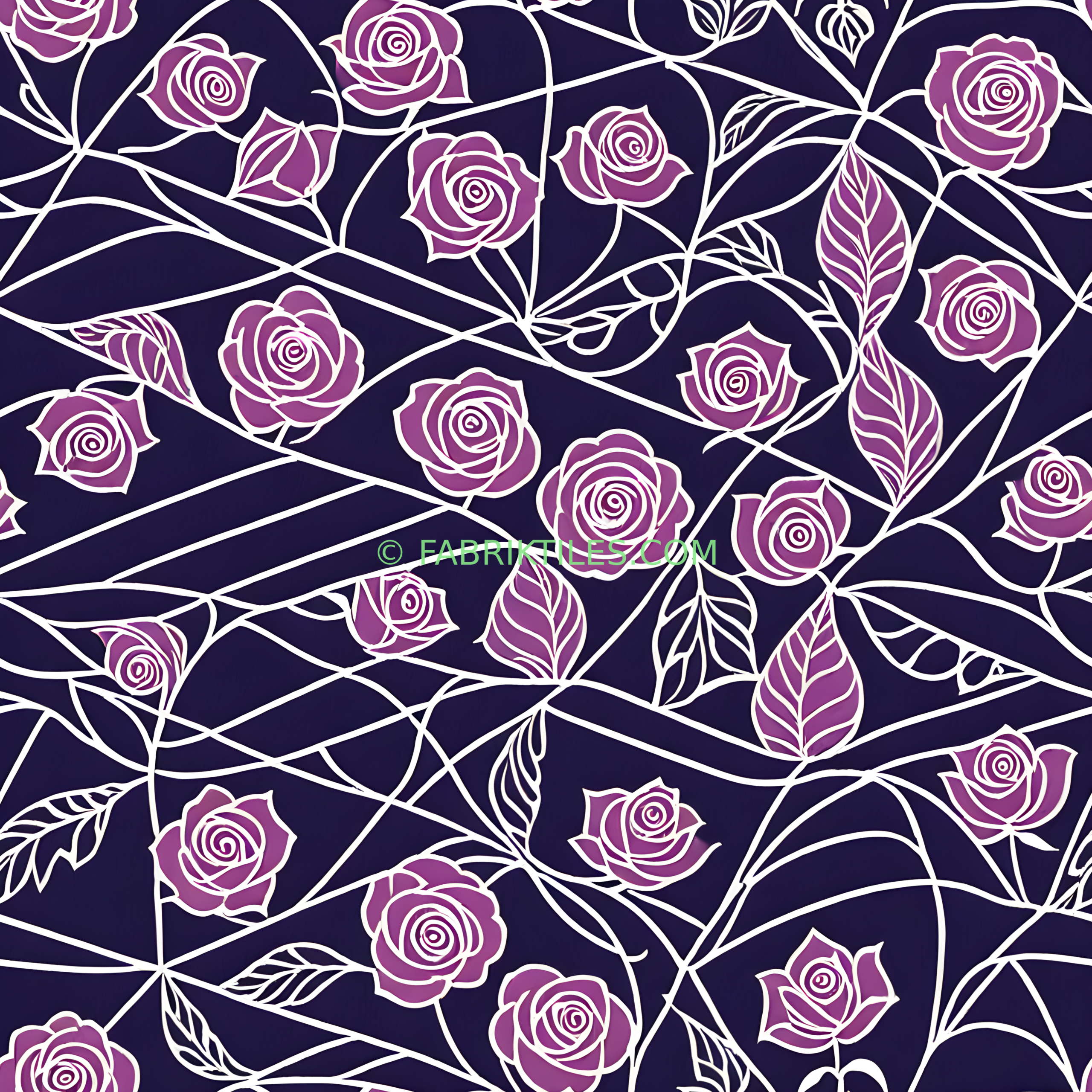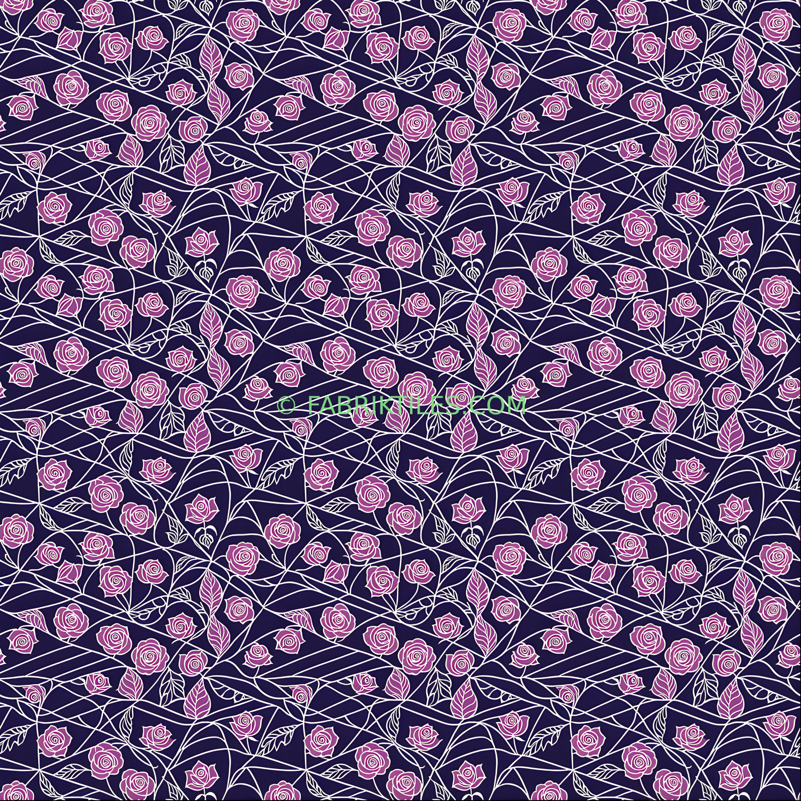 This pattern features elegant purple roses and flowing leaves set against a deep navy background. The design has a delicate, romantic feel with clean white outlines that highlight the intricate floral details. It’s perfect for adding a touch of vintage charm to any space.