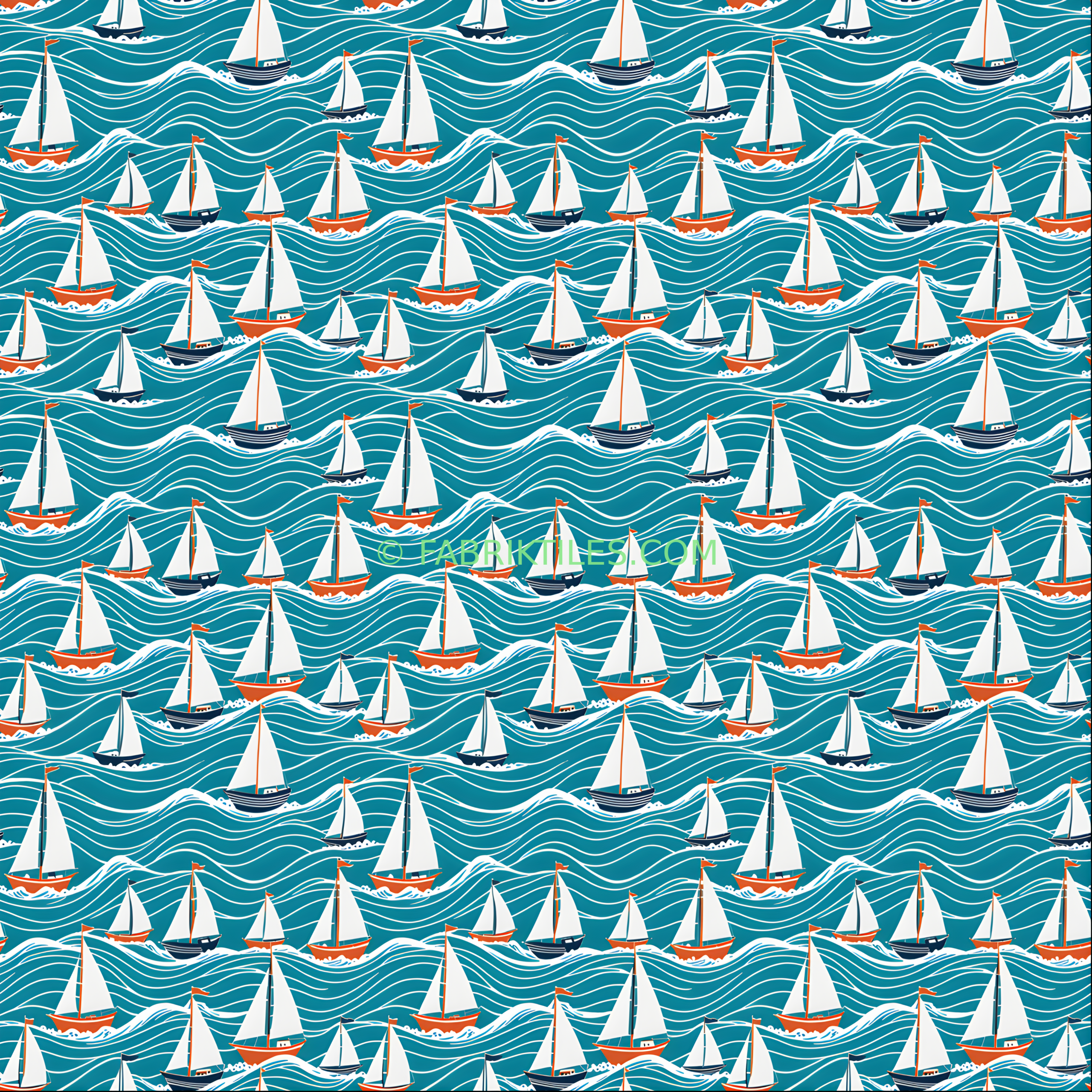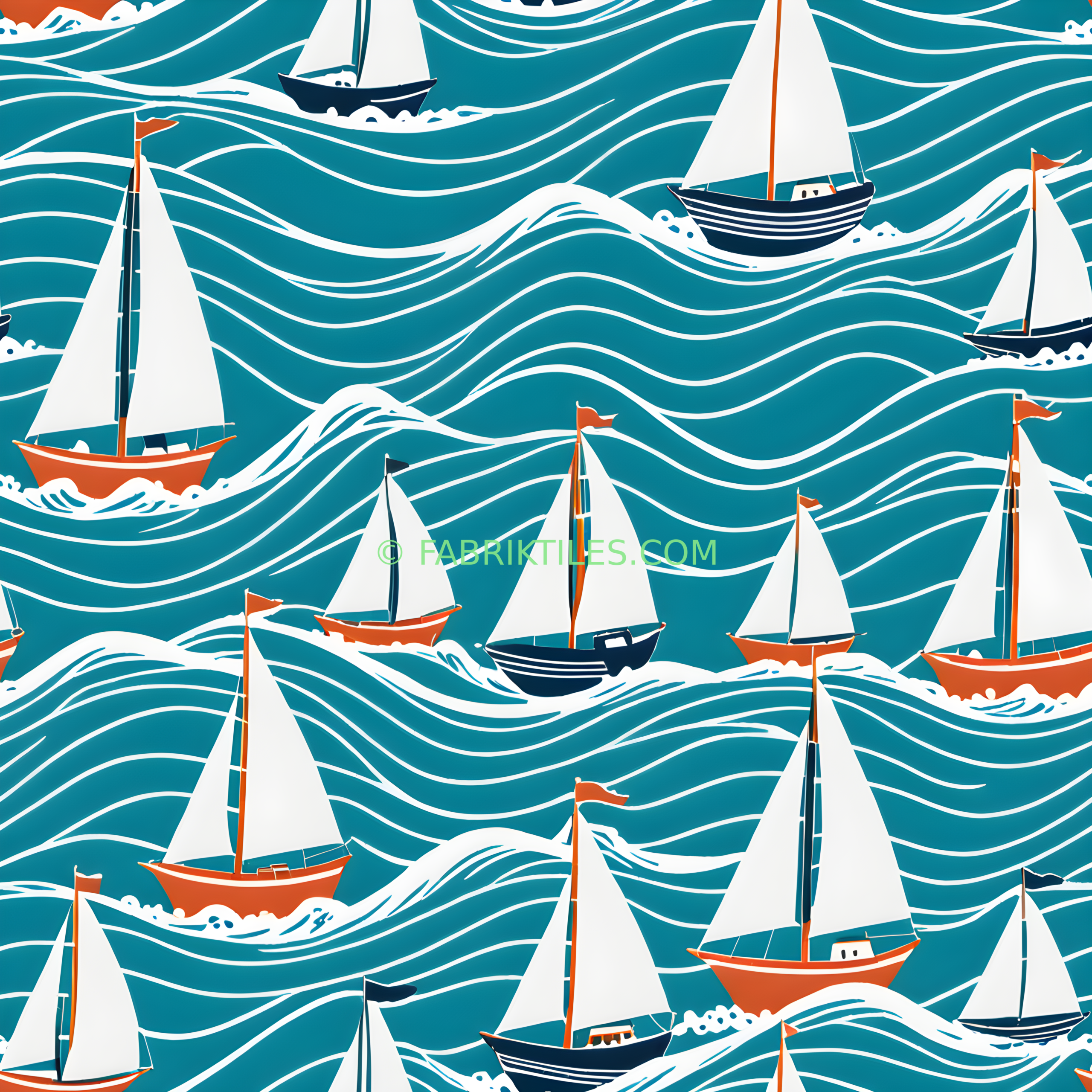 This vibrant pattern features sailboats gliding across dynamic ocean waves, rendered in bold teal, white, and warm orange tones. The playful, nautical design evokes a sense of adventure and coastal charm, perfect for bringing a maritime feel to any space. The stylized waves and colorful boats create a lively, energetic mood.