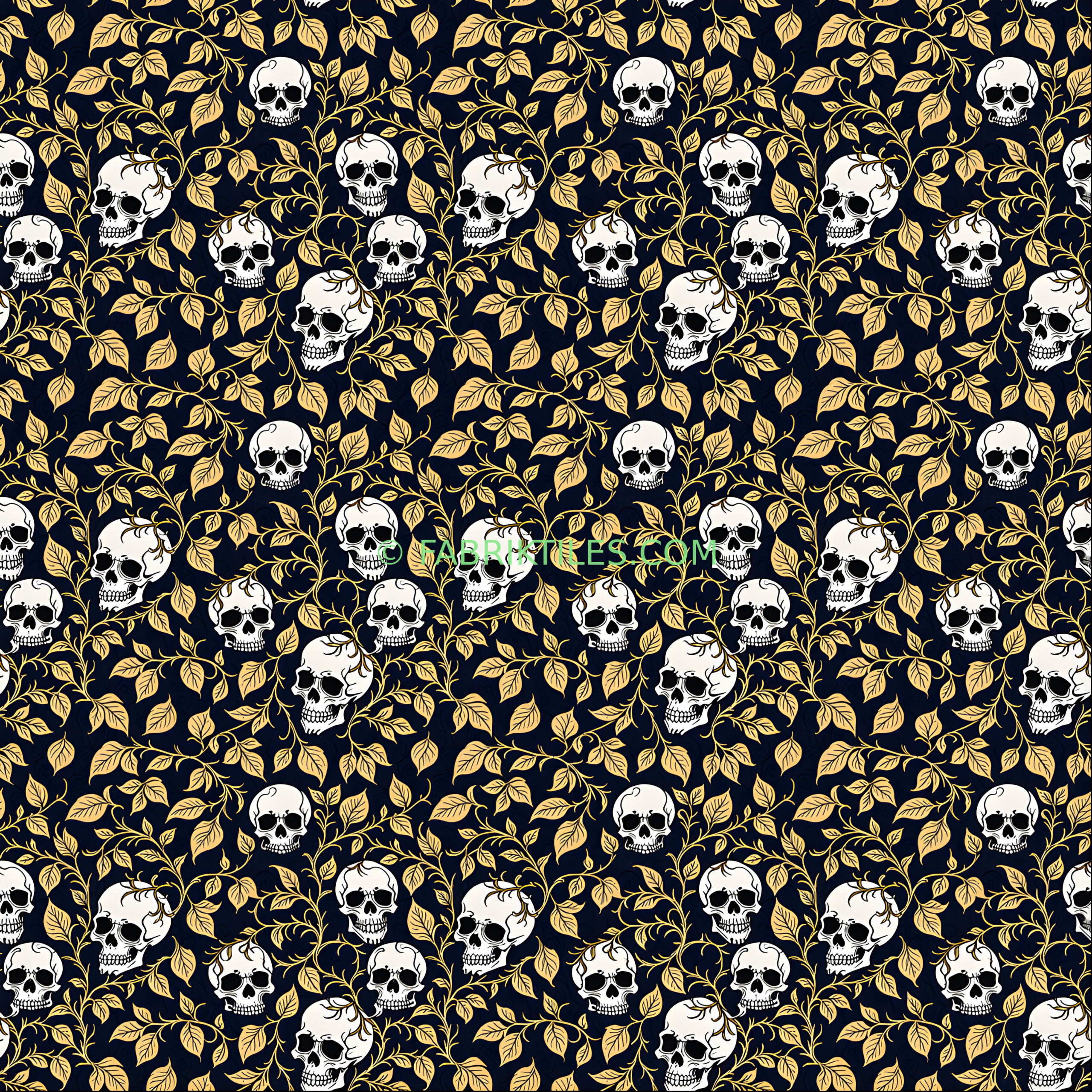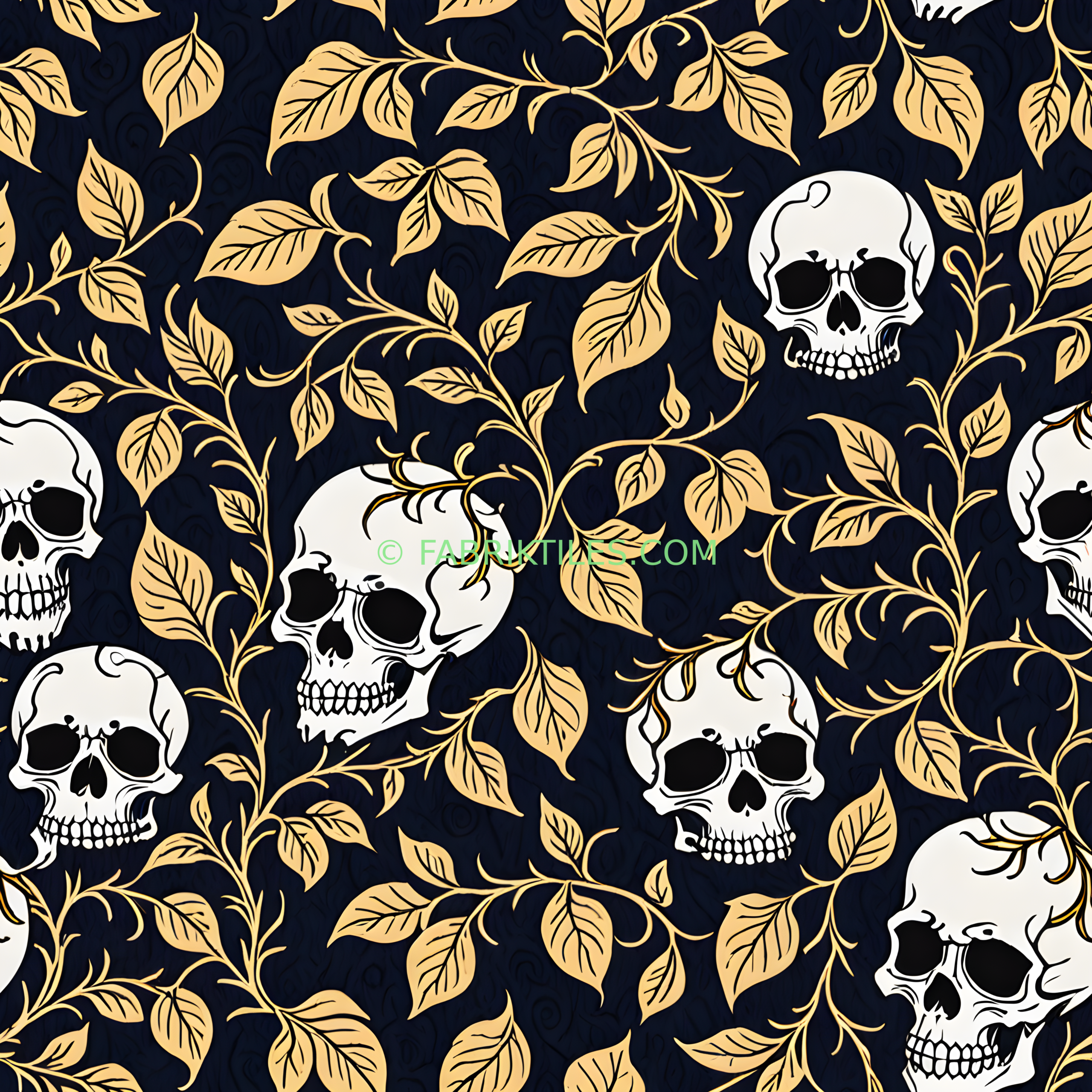 A striking pattern featuring elegant white skulls intertwined with delicate golden vines and leaves against a deep navy background. The design blends gothic elements with ornate botanical details, creating a mysterious and sophisticated mood. The contrast of light and dark tones gives the pattern a rich, dramatic feel.