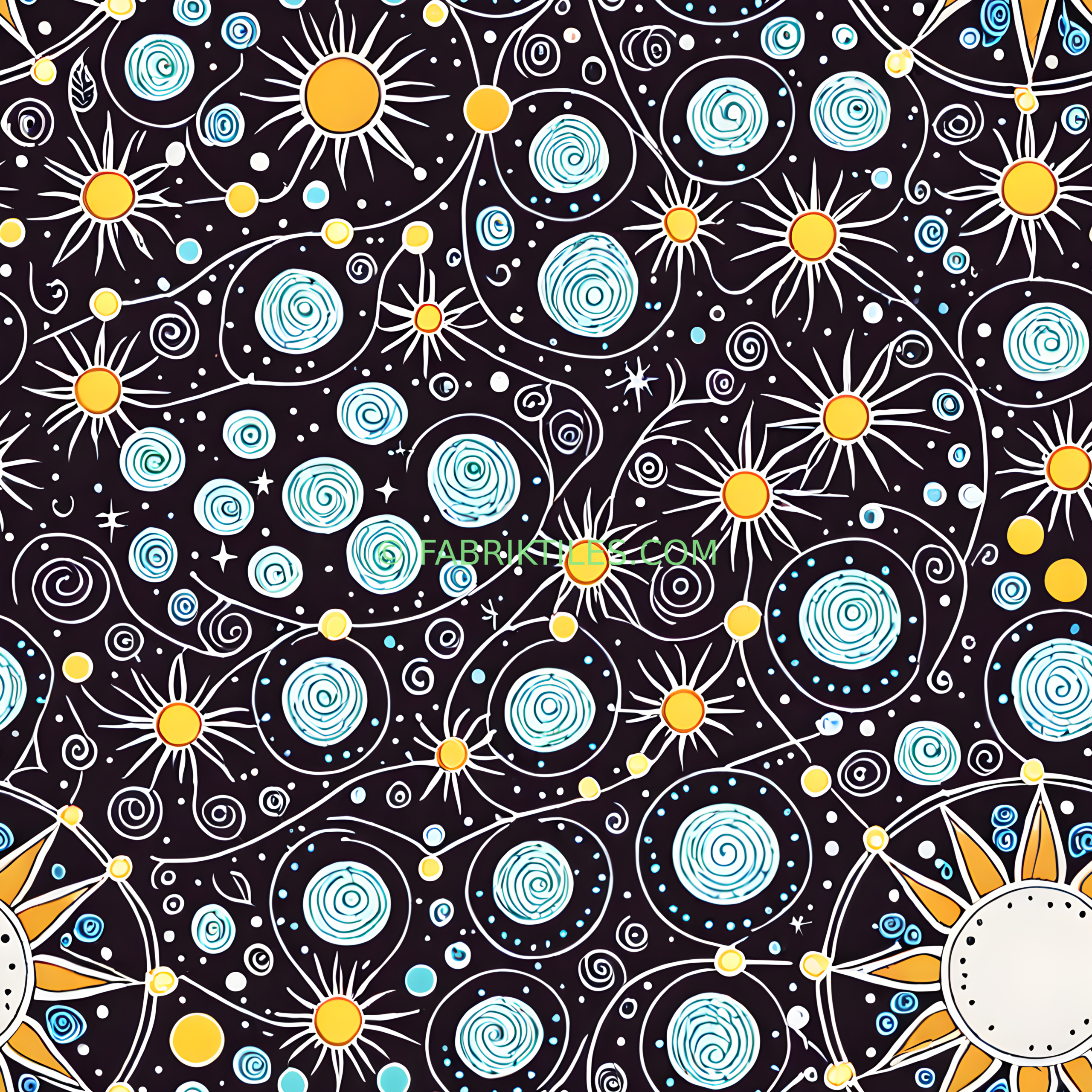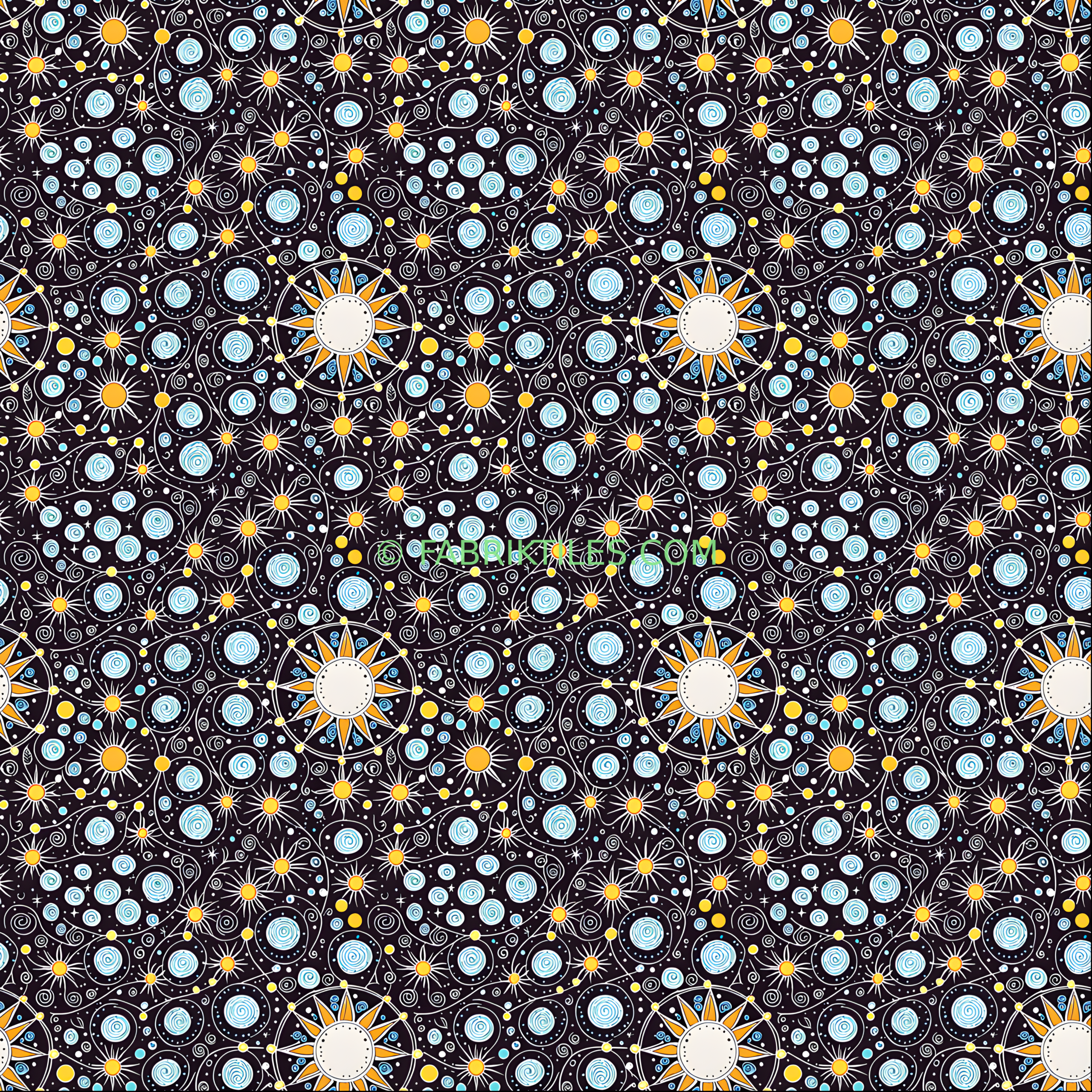 A vibrant celestial pattern featuring radiant sunbursts, swirling galaxies, and twinkling stars against a deep black background. The design combines warm golden yellows with cool blues and crisp white lines, creating a dynamic and dreamy cosmic atmosphere. Inspired by starry nights and celestial motion, it feels both whimsical and expansive.