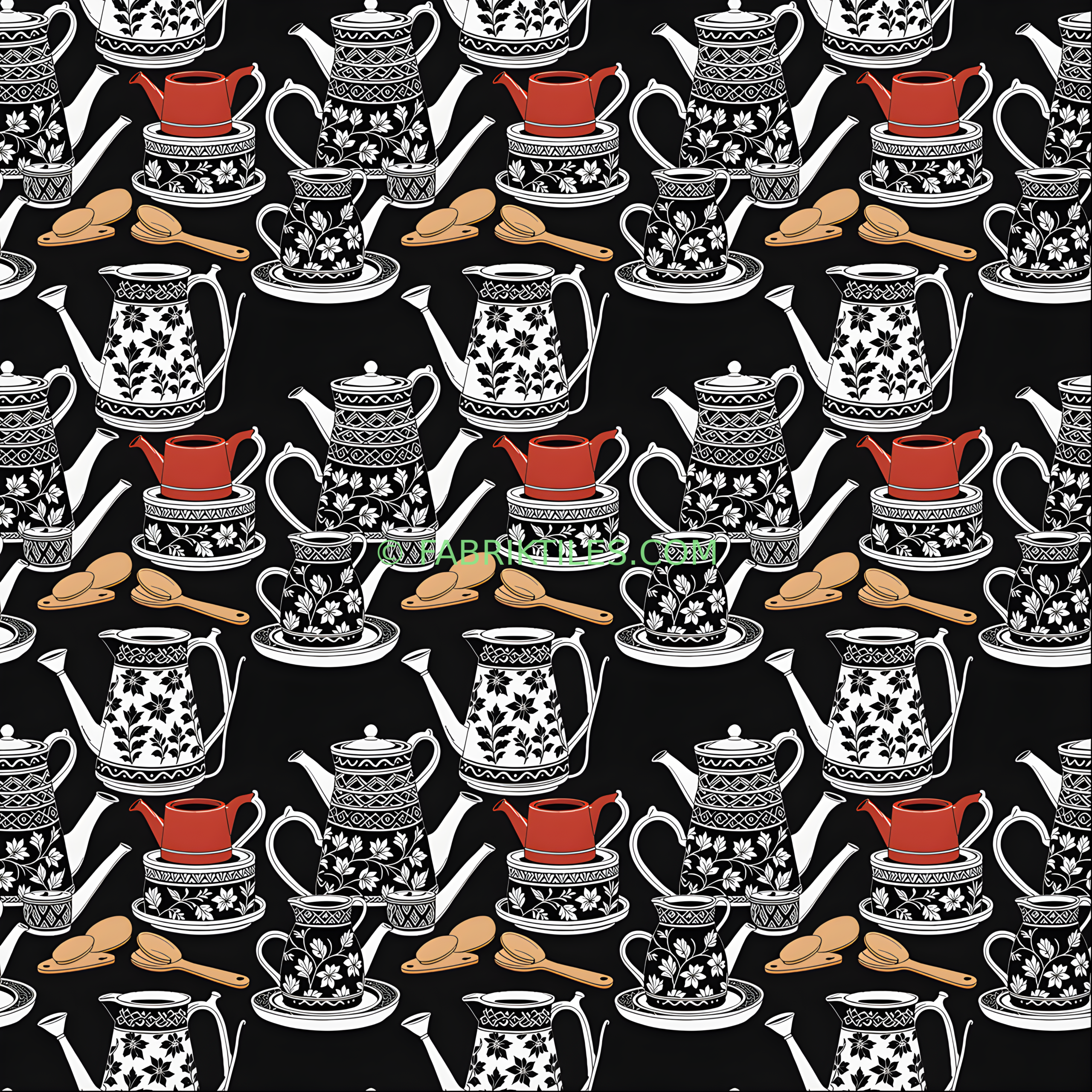 A whimsical pattern featuring an array of teapots, cups, and wooden spoons set against a deep black background. The design combines intricate black-and-white botanical motifs with a bold red teapot and warm brown spoons, creating a playful yet elegant contrast. The overall mood is cozy and inviting, perfect for a vintage-inspired tea time.
