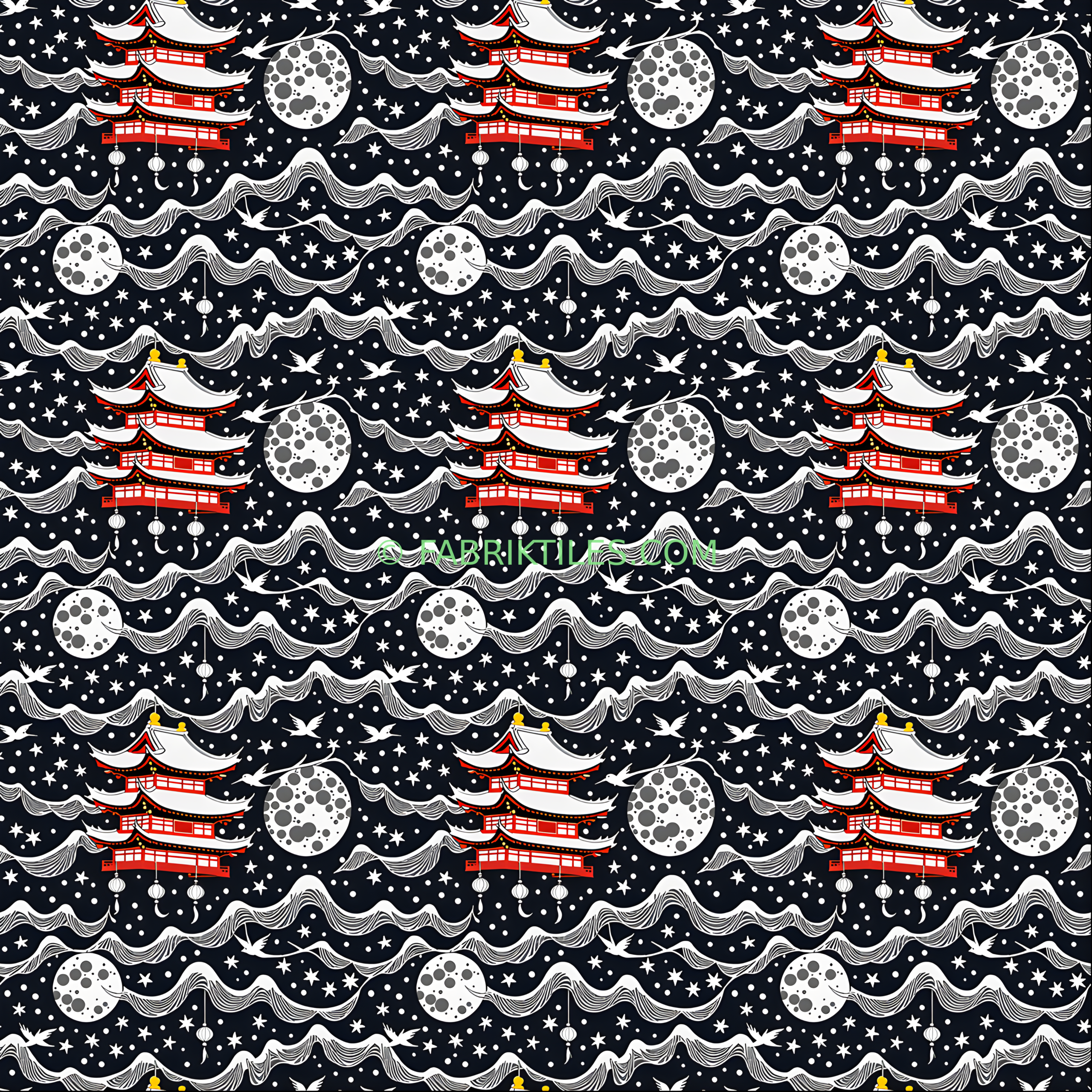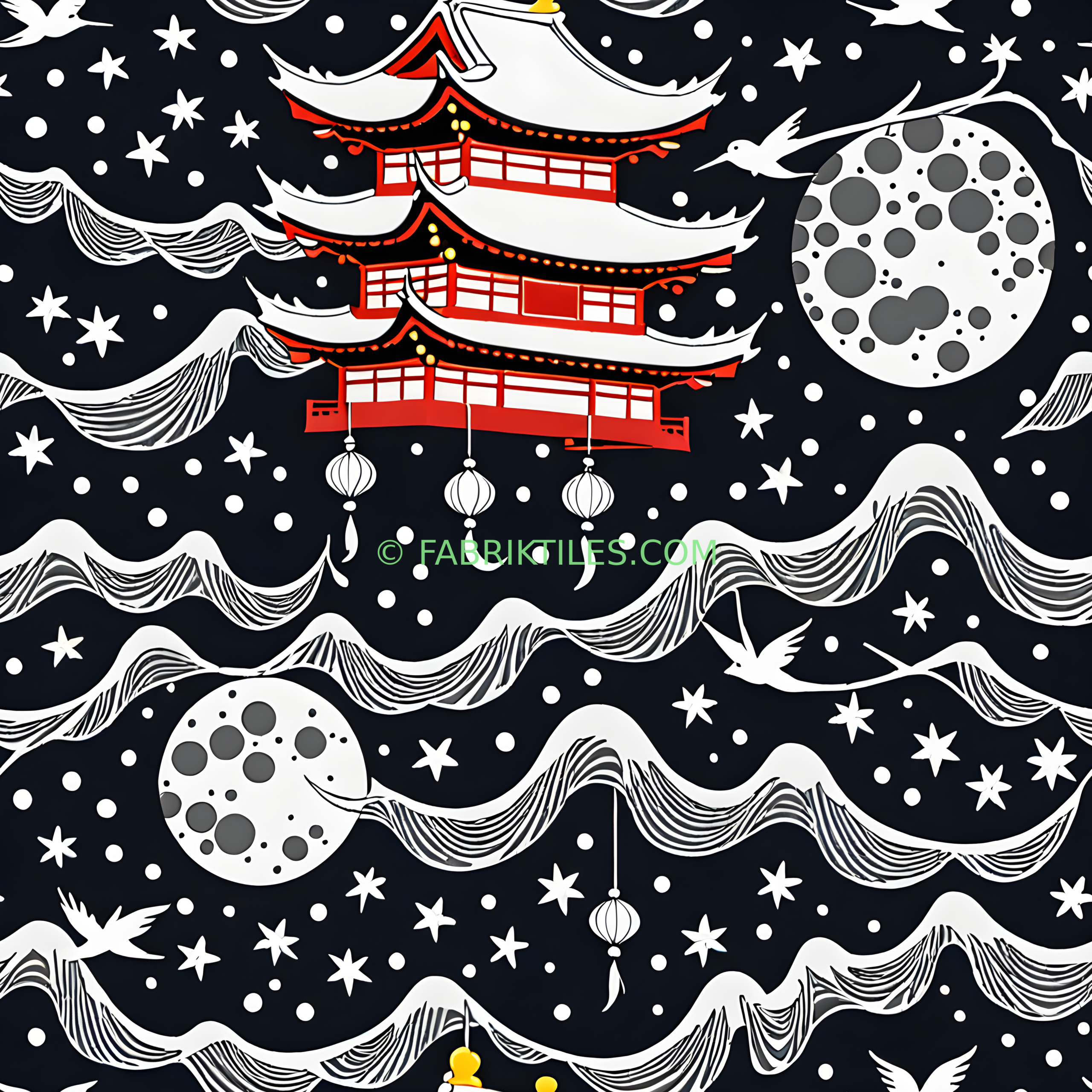 A striking pattern featuring a traditional red and white pagoda floating above stylized waves under a starry night sky. White cranes soar past a full moon with cratered details, while delicate lanterns hang from the temple. The bold contrast of white and red against a deep black background creates a mystical and serene atmosphere.