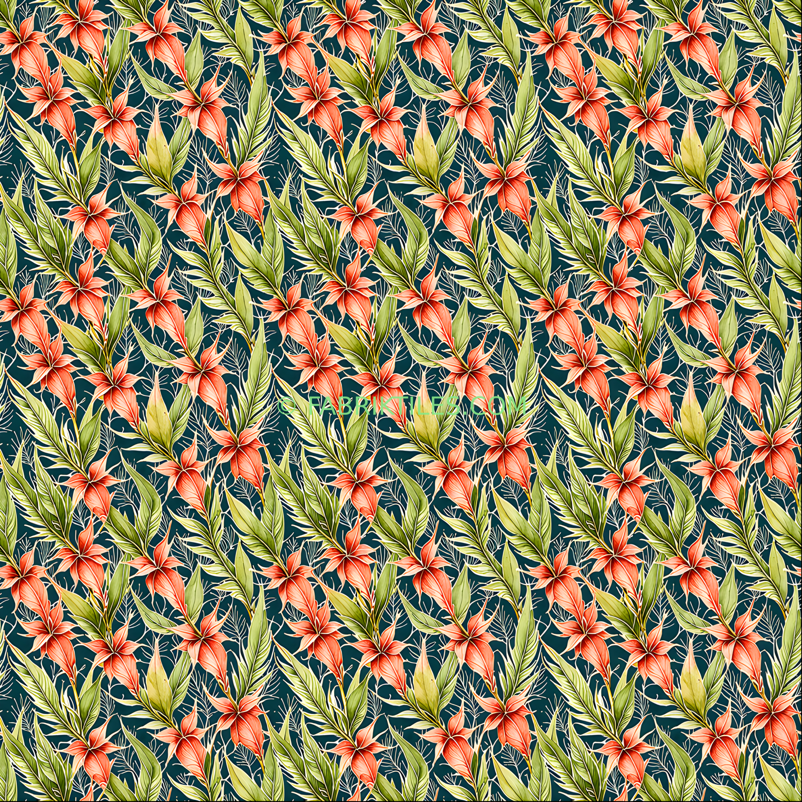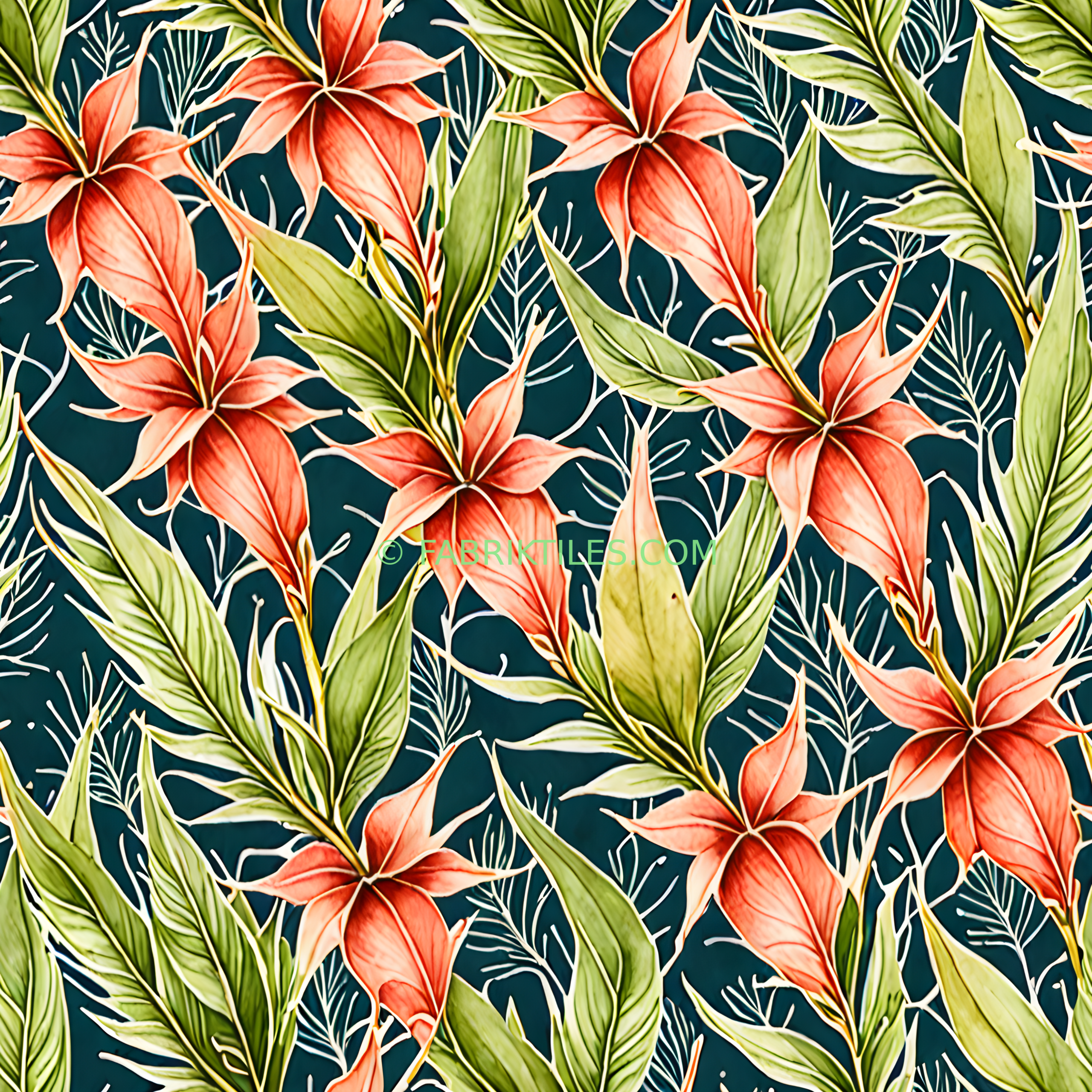 Vibrant coral lilies bloom amidst lush green foliage against a deep teal backdrop, creating a lush, tropical atmosphere. The intricate botanical details and rich color palette evoke a sense of exotic beauty and natural elegance. This pattern blends bold floral elements with delicate leafy accents for a striking, nature-inspired design.